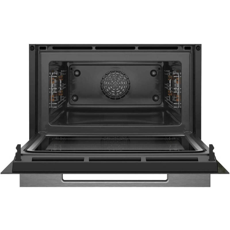 Функция позволяет управлять Bosch CMG7241W1 удаленно с помощью смартфона. Во время работы прибора температура дверцы не превышает 30°С. Очистка камеры — паровая. За безопасность отвечают блокировка управляющего модуля и автоматическое отключение при долгой работе.