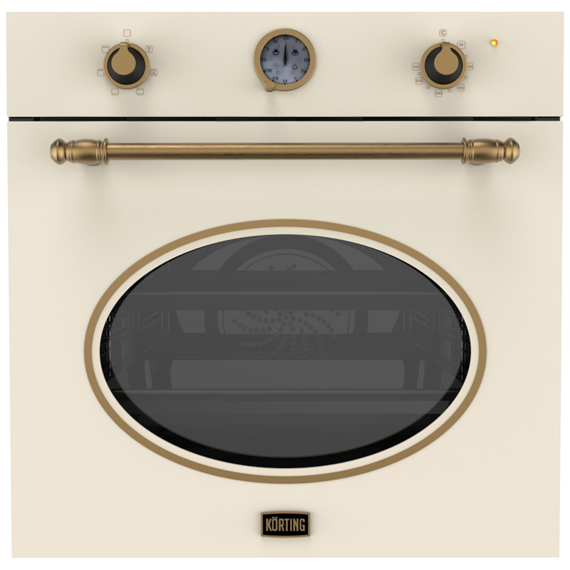 Духовой шкаф выполнен в цвете слоновой кости, что придает ему элегантный и стильный вид. Ручки и регуляторы выполнены в бронзовом цвете, что добавляет нотку ретро-стиля. Металлический шильд с логотипом Korting подчеркивает бренд и качество изделия.