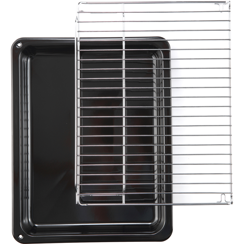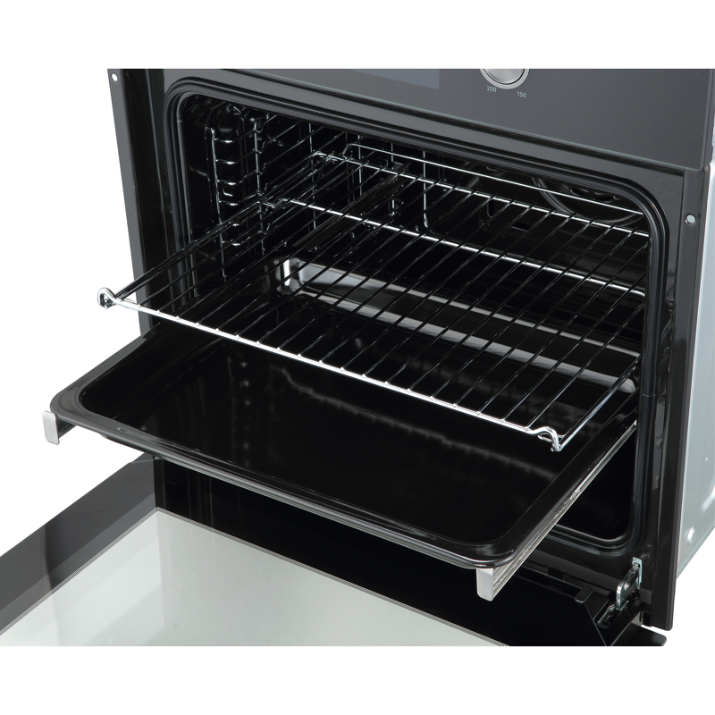 В камере предусмотрены хромированные боковые решетки с пятью уровнями установки противней. На одном из уровней установлены телескопические направляющие, которые позволяют безопасно выдвигать горячий противень за пределы духовки. Это значительно упрощает процесс проверки готовности блюда или добавления ингредиентов без риска обжечься.