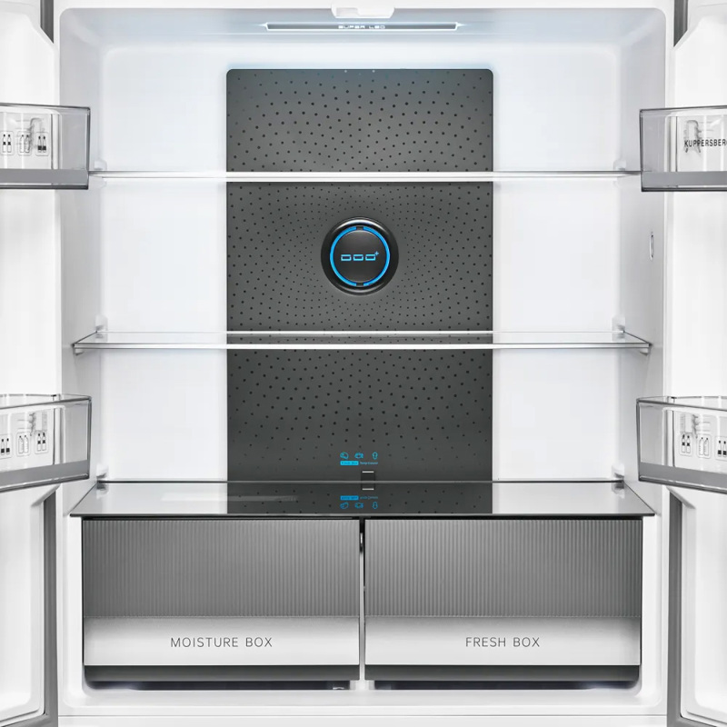 Отдельностоящий холодильник Kuppersberg NFFD 186 BG оснащен четырьмя распашными дверцами, которые обеспечивают доступ к секциям без необходимости открывать всю камеру. Прибор габаритами 182,2х83х64,7 мм работает от тихого инверторного компрессора и относится к классу энергопотребления А++. Благодаря дизайну в стиле high-tech он органично вписывается в обстановку современной кухни.