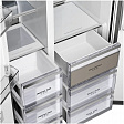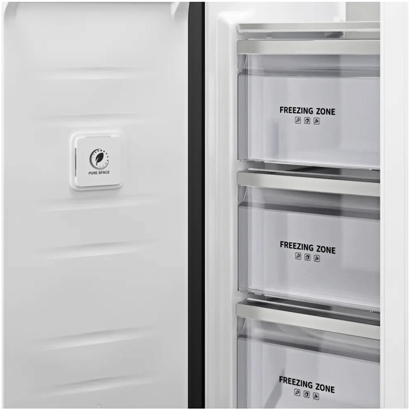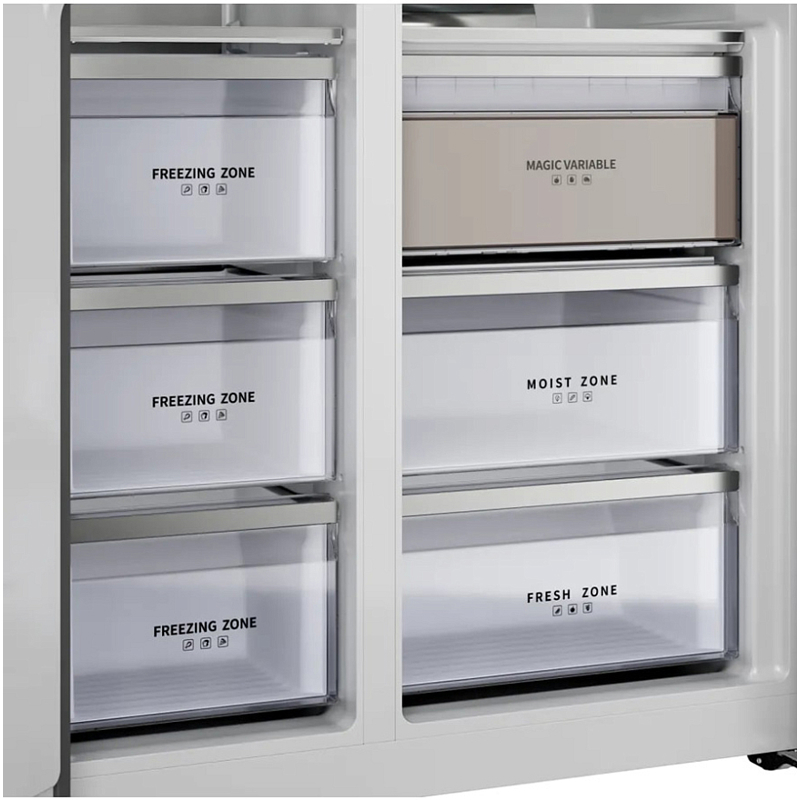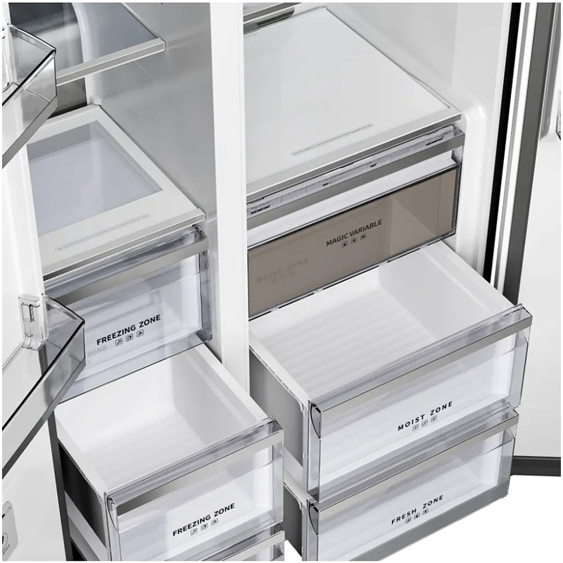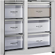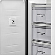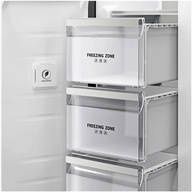 Морозильное отделение оснащено автоматической системой размораживания, 7 полками, 3 ящиками и лотком для приготовления кубиков льда. Производительность морозильного отделения составляет 10 кг/сутки.