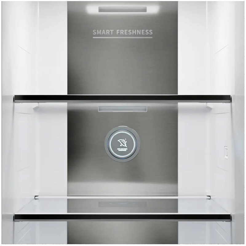 Внутри холодильника расположено 14 полок, выполненных из стекла, и 3 ящика для овощей и фруктов. Зона свежести позволяет сохранять продукты свежими на протяжении длительного времени. Освещение на основе светодиодных ламп обеспечивает равномерное и яркое освещение всего пространства.