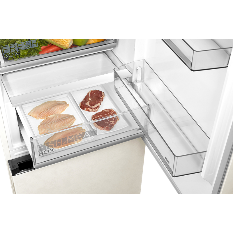 Внутренняя организация холодильника тщательно продумана. Полезный объем составляет 346 л, из которых 223 л отведено под холодильную камеру с тремя стеклянными полками и двумя ящиками, а 123 л — под нижнюю морозильную камеру. Ключевой особенностью является наличие двух зон свежести для специализированного хранения продуктов, а выдвижные полки Easy Get обеспечивают легкий доступ к содержимому.