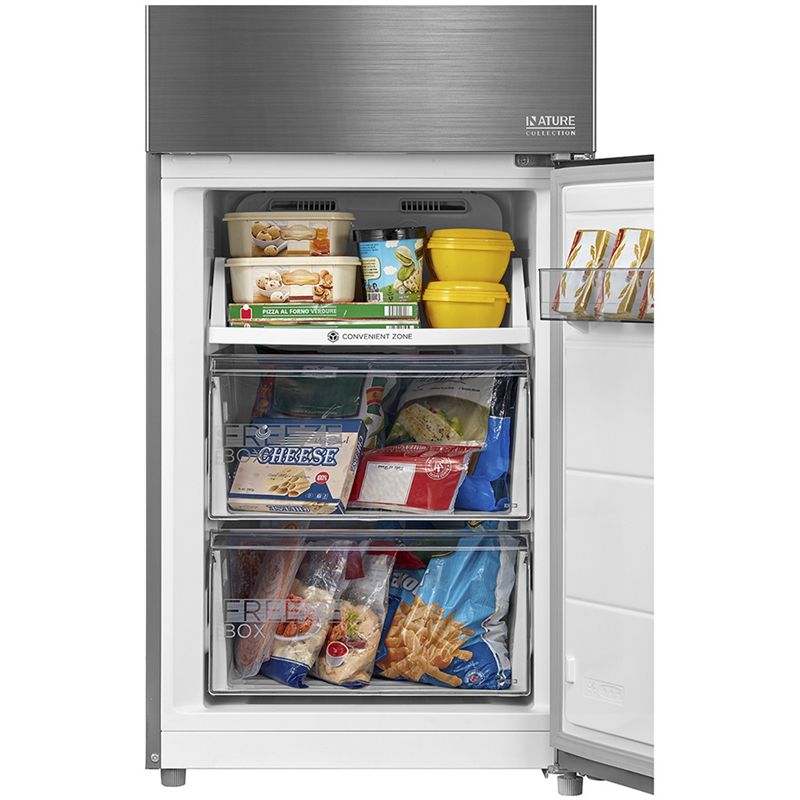 Внутреннее наполнение холодильника тщательно продумано для максимального удобства хранения. Прочные полки из закаленного стекла легко выдерживают значительный вес, а их конфигурацию можно менять. Холодильная камера объемом 223 л оборудована двумя вместительными ящиками и тремя полками на дверце. Особого внимания заслуживает дополнительная зона свежести Metal Cooling, предназначенная для деликатного хранения мяса, рыбы и сыров. Морозильная камера на 123 л с мощностью замораживания 14 кг/сутки включает три выдвижных контейнера.