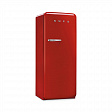 Холодильник выполнен в стиле 50-х годов с плавными линиями, округлыми формами и фирменной ручкой. Яркий красный цвет придает ему выразительность, превращая технику в элемент декора.