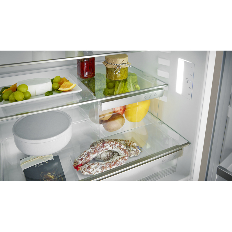 Панель расположена внутри корпуса. Температура устанавливается в диапазоне от +2°C до +9°C. При крупной загрузке продуктов будет полезен режим SuperCool - «Суперохлаждение». Доступ к настройкам может быть заблокирован - эта функция будет полезна семьям с маленькими детьми.