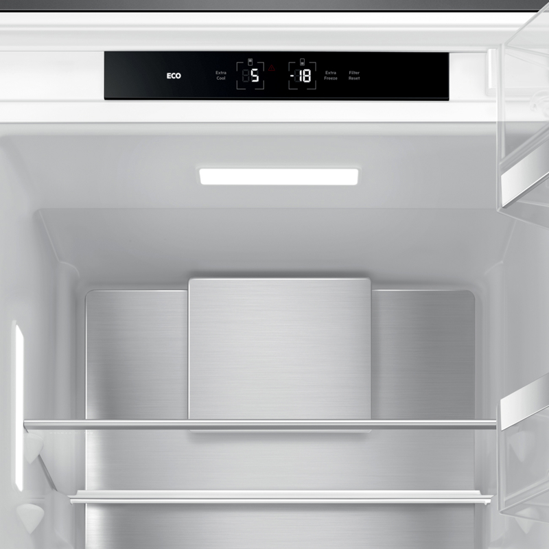 Холодильное отделение рационально организовано с помощью трех регулируемых стеклянных полок, одной полки для бутылок и контейнера с прозрачной стеклянной крышкой. Фирменная система MultiFlow обеспечивает равномерную циркуляцию холодного воздуха по всему объему камеры. В зоне свежести с двумя контейнерами для овощей и фруктов поддерживается оптимальная влажность. На дверце расположены две регулируемые полки, а внутреннее пространство освещается современной энергоэффективной LED-подсветкой.