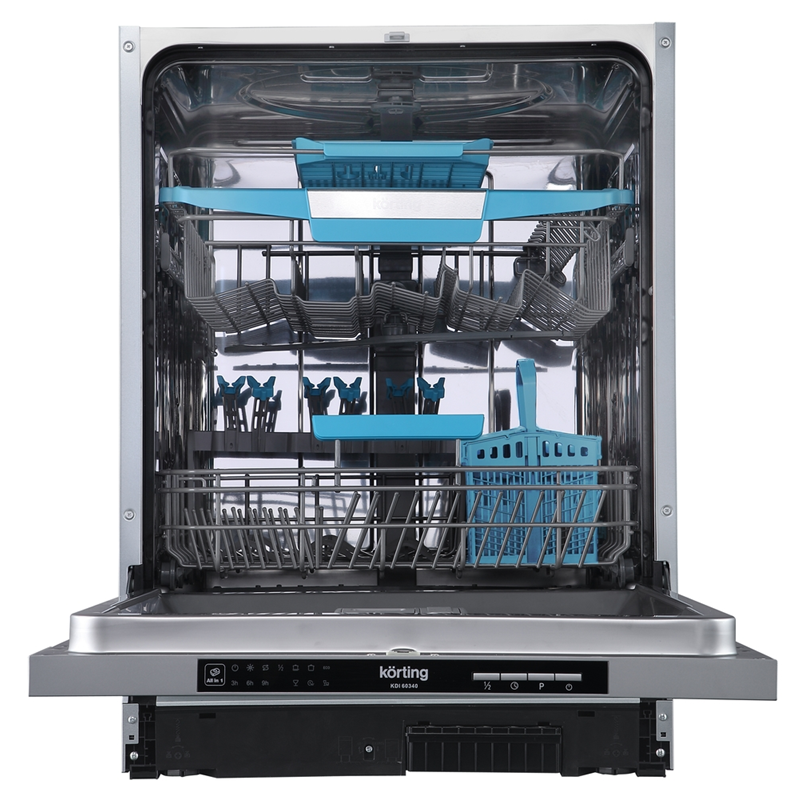 Korting KDI 60340 обладает вместительностью, позволяющей одновременно мыть до 14 комплектов посуды. Устройство оснащено несколькими корзинами и полками, которые позволяют удобно разместить посуду, столовые приборы и кухонные аксессуары, обеспечивая их надежное удержание во время мойки.