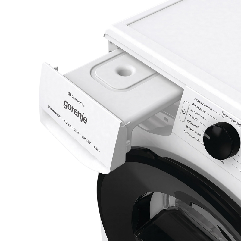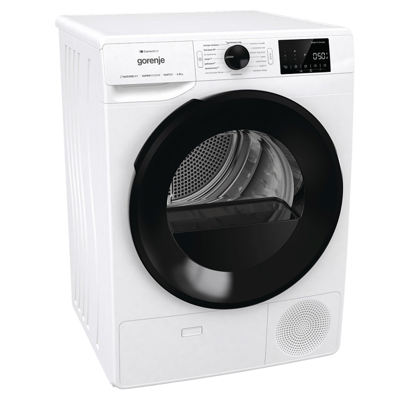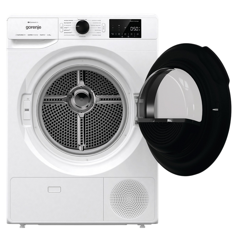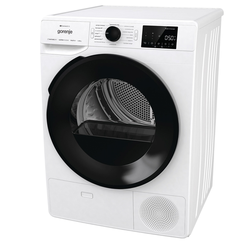 Цифровой дисплей сушильной машины GORENJE DGPNE82GNLW обеспечивает удобное и интуитивно понятное управление. На экране отображается вся необходимая информация о процессе сушки, включая выбранную программу, оставшееся время и другие параметры. Функция Wi-Fi управления позволяет управлять машиной дистанционно через мобильное приложение, что добавляет удобства и гибкости в использовании.