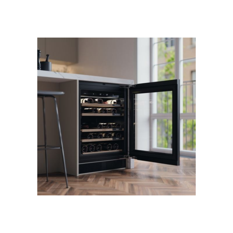 Шкаф оснащён тройным стеклом с УФ-фильтром, защищающим вино от вредного воздействия ультрафиолетового излучения. Система поддерживает оптимальный уровень влажности (50-80%), предотвращая высыхание пробок.
