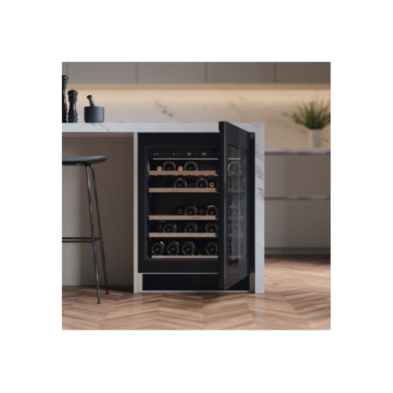 Шкаф вмещает до 44 бутылок вина, которые размещаются на удобных выдвижных деревянных полках. Каждая полка оснащена телескопическими направляющими для плавного выдвижения. В комплекте идут меловые таблички для маркировки содержимого.