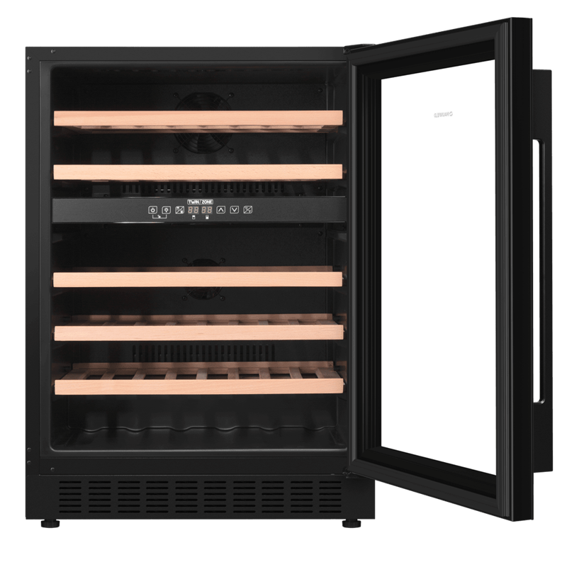 Шкаф имеет две зоны, для каждой из них можно задать свой режим охлаждения — это актуально для тех, кто планирует хранить дома разные виды напитка: красное, белое, шампанское.