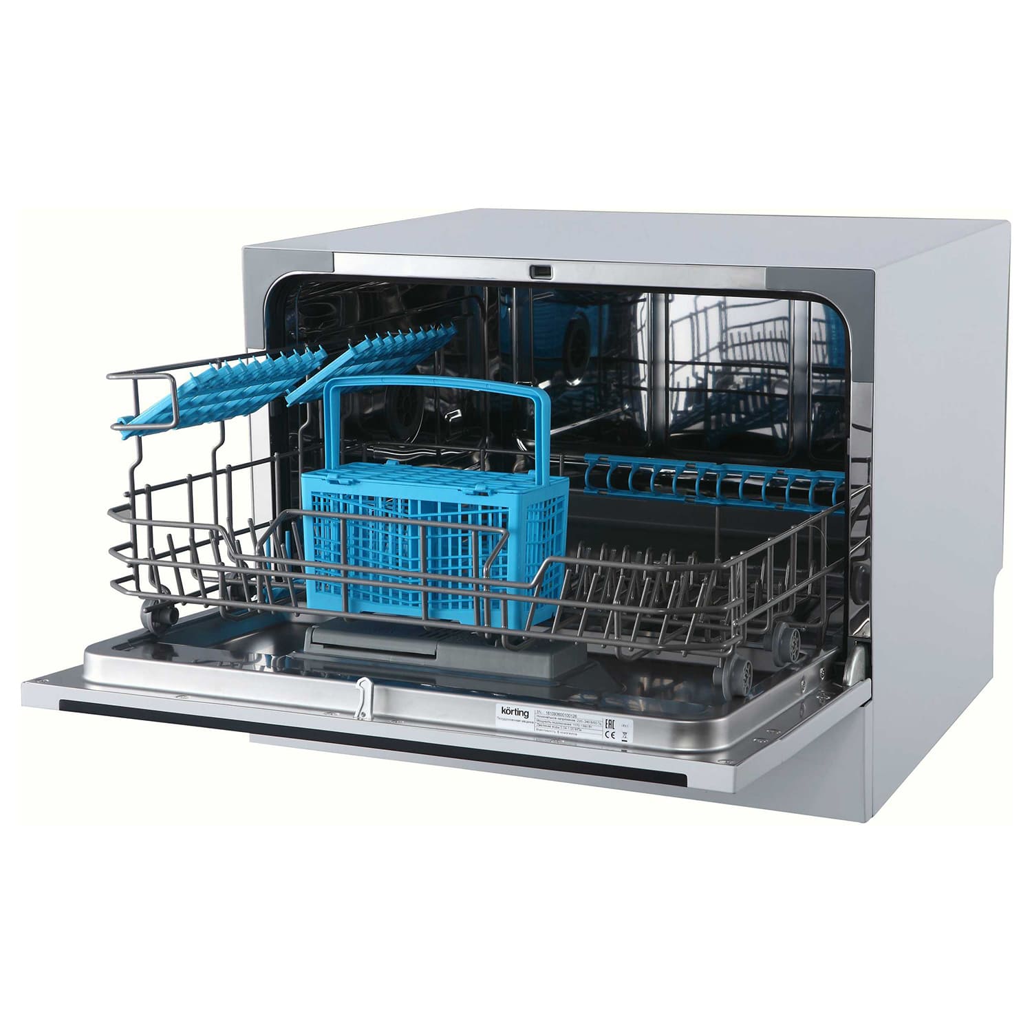 При своих видимых небольших габаритах, компактная посудомоечная машина Korting вмещает в себя целых 6 комплектов посуды, что вполне подходит даже тем, кто часто готовит дома и использует объемные блюда.