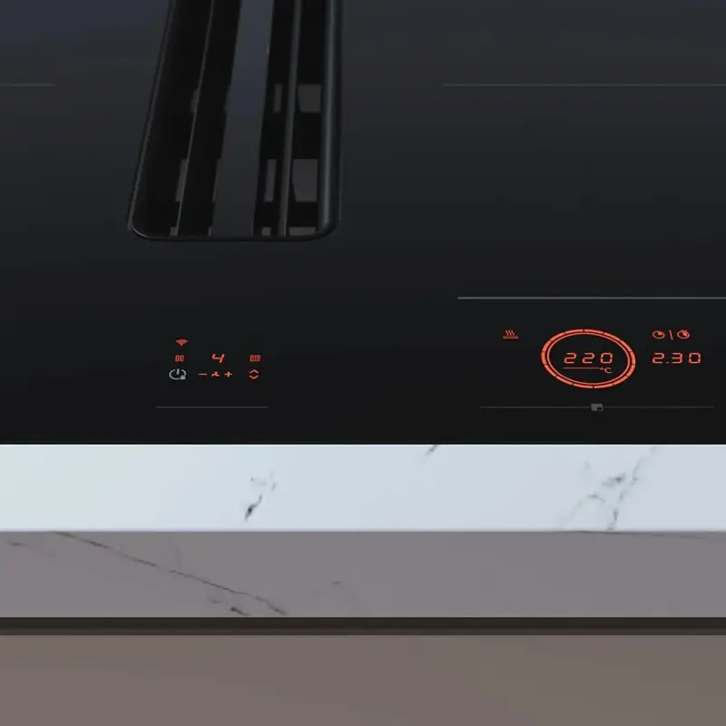 Встроенная вытяжка оснащена поднимающимся встроенным модулем и обладает производительностью 617 м³/ч. Это обеспечивает эффективное удаление запахов и пара, что делает кухню более комфортной и чистой. Поднимающийся модуль позволяет легко регулировать высоту вытяжки в зависимости от размера посуды и интенсивности приготовления.
