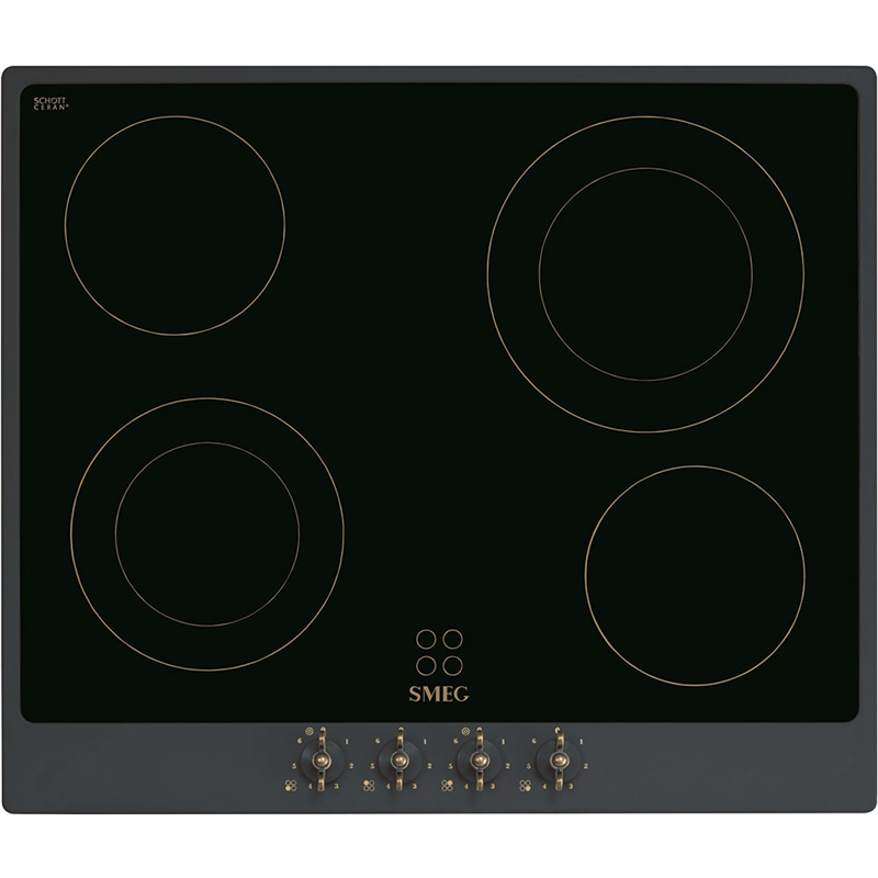 Варочная панель SMEG P864AO из серии Coloniale выполнена из черной стеклокерамики Suprema и дополнена рамкой цвета «антрацит». Данная модель оснащена 4 конфорками Hi-Light, 2 из которых — двухконтурные, что позволяет выбирать зону нагрева в зависимости от диаметра используемой посуды. С помощью поворотных переключателей настроить работу устройства можно быстро и легко. Безопасность эксплуатации гарантирует защита от перегрева.