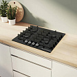 Поверхность из закаленного стекла отличается упрощенным уходом: пролитые жидкости и небольшие загрязнения удаляются влажной салфеткой, и пластичная структура покрытия не теряет блеска даже при регулярном использовании. Решетки из чугуна устойчивы к высоким температурам и механическим нагрузкам, их массивная конструкция надежно фиксирует посуду, исключая скольжение. Минимальная толщина столешницы для встраивания - 30 мм, что делает монтаж возможным в стандартных кухонных модулях; ниша по ширине 56-56.2 см и глубине 48-49 см соответствует типовым параметрам установки, упрощая интеграцию в обновлённый гарнитур.