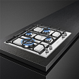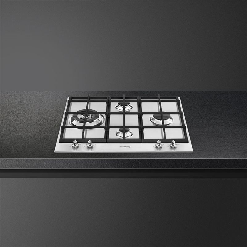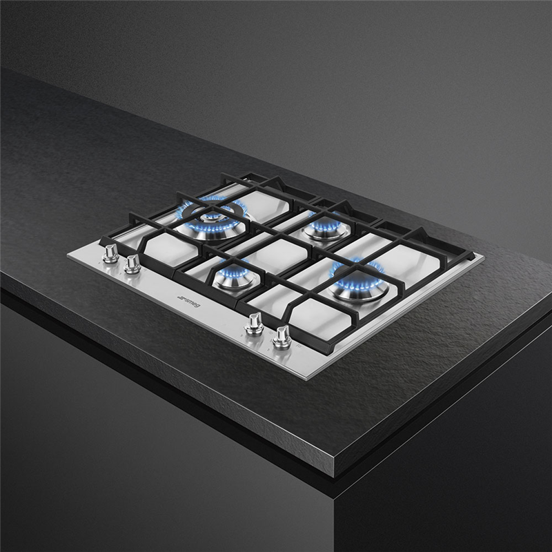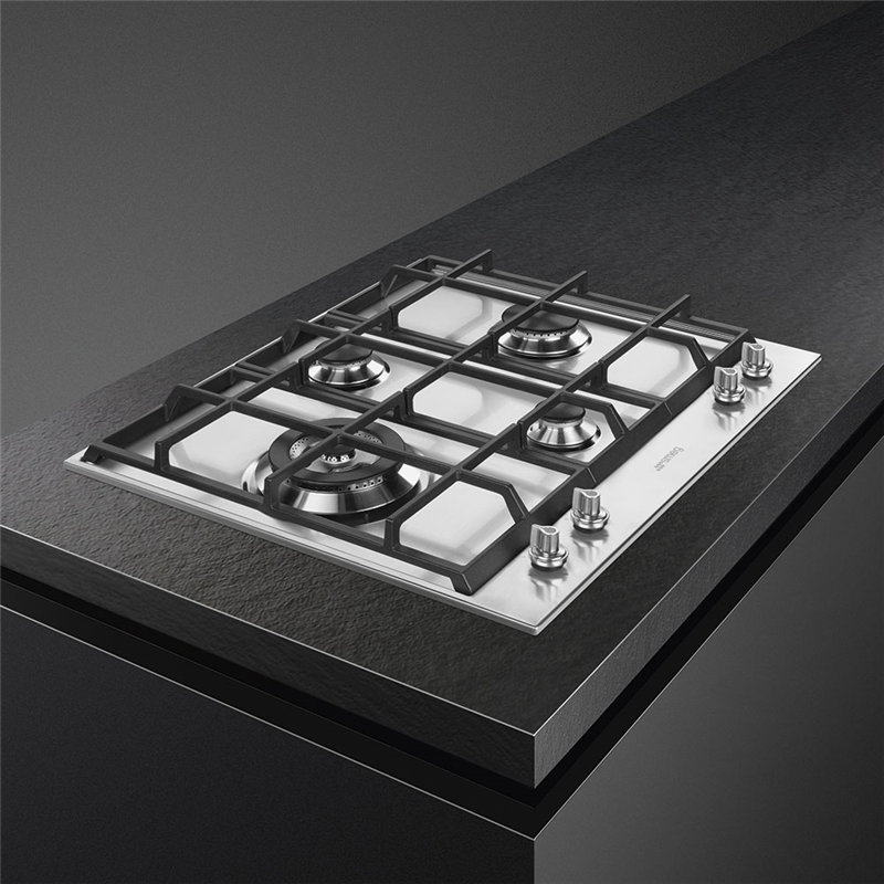 Газовая варочная панель шириной 60 см входит в коллекцию Linea. Матовая нержавеющая сталь, использованная в качестве материала поверхности, удачно сочетается с хромированными поворотными переключателями. На матовом покрытии не видны отпечатки пальцев. Варочная панель предназначена для использования природного газа (G 20), однако в комплекте идут жиклеры для работы на сжиженном газе. Это очень удобно, если варочная поверхность покупается для дачного дома. Но менять жиклеры и подключать прибор к газовым баллонам должен только специалист. На варочной поверхности размещены 4 конфорки различной мощности. Система размещения в виде ромба обеспечивает доступ одновременно к трем горелкам. Одна из конфорок имеет три контура пламени (тройная корона), благодаря чему обеспечивает ускоренный нагрев. Используйте ее, если готовите в посуде большого размера. Прочные решетки из чугуна обеспечивают устойчивое положение емкостей над пламенем. Чугун не боится высокой температуры и не деформируется под весом посуды. Чтобы правильно расположить решетки на поверхности прибора, обратите внимание на нанесенные на них метки. Чтобы зажечь конфорку, достаточно повернуть соответствующую ручку – варочная панель оснащена автоматическим электроподжигом. В случае затухания пламени утечки газа не произойдет благодаря системе безопасности газ-контроль.