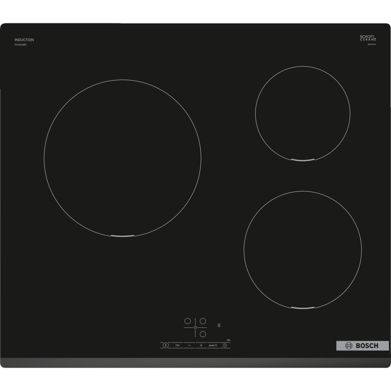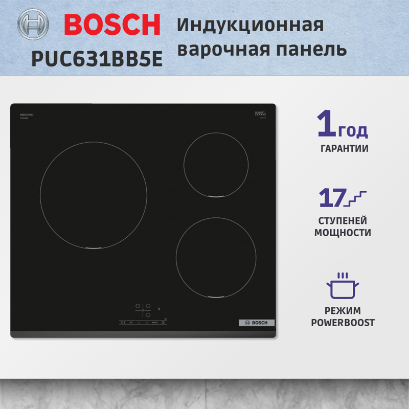 Индукционная варочная панель Bosch PUC631BB5E - это трехконфорочное устройство, выполненное в черном цвете. Варочная поверхность изготовлена из стеклокерамики, что придает ей элегантный внешний вид и упрощает уход. Управление панелью осуществляется с помощью сенсоров и системы TouchSelect, что делает процесс взаимодействия с устройством простым и понятным.
