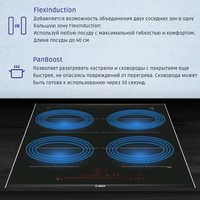 BOSCH PXY875DC1E оснащена четырьмя мощными конфорками, которые позволяют готовить несколько блюд одновременно. Функция Flex Zone предоставляет возможность объединять две конфорки в одну большую зону, что идеально подходит для использования крупных кастрюль или сковород. Это делает приготовление пищи более универсальным и комфортным, позволяя вам готовить с максимальной эффективностью.