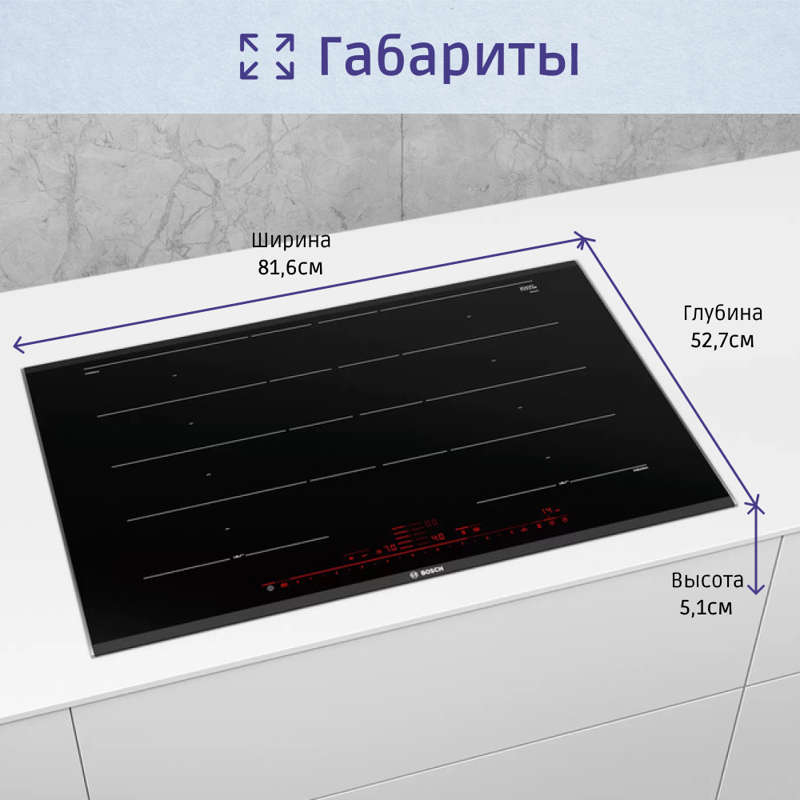 Как независимая модель, варочная панель BOSCH PXY875DC1E предоставляет больше свободы в дизайне кухонного пространства. Отсутствие рамки создает минималистичный вид и облегчает интеграцию в любые кухонные гарнитуры.