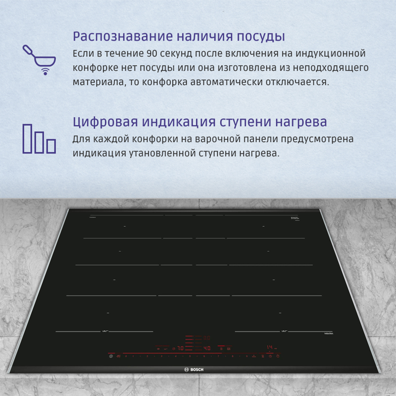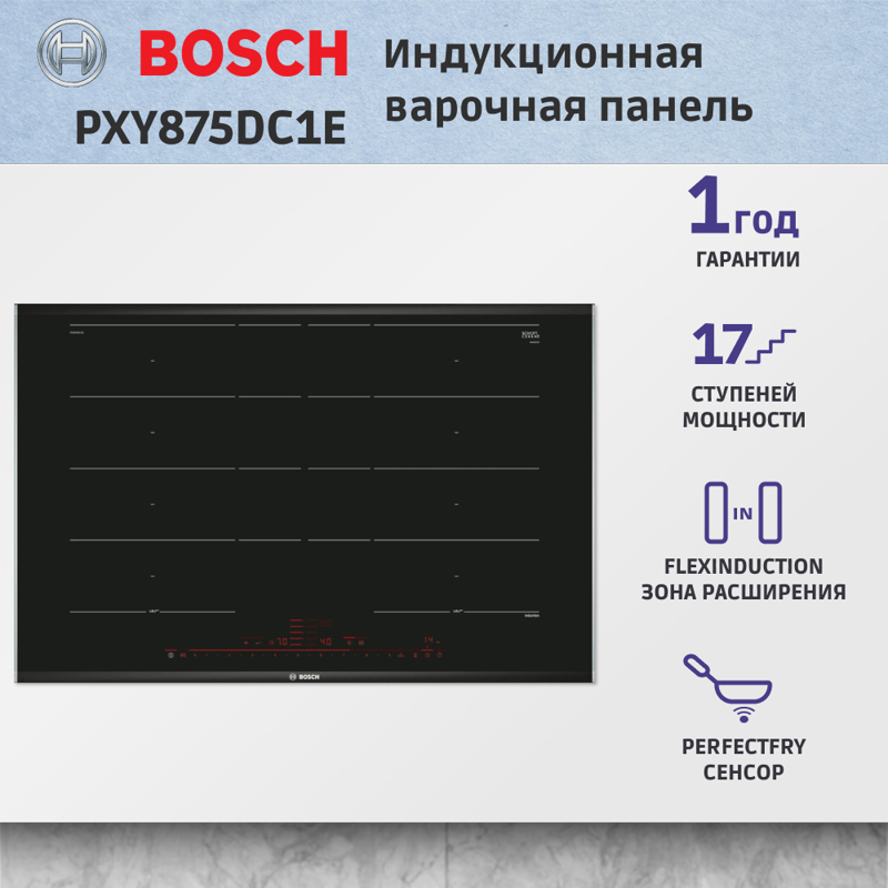 Интуитивно понятное сенсорное управление позволяет легко и быстро выбирать режимы работы. Индукционная варочная панель BOSCH PXY875DC1E имеет 17 уровней мощности, что обеспечивает точное регулирование тепла и позволяет готовить блюда с идеальной температурой. Это и удобство, и возможность добиться идеального результата при приготовлении, делая каждое блюдо настоящим кулинарным шедевром.
