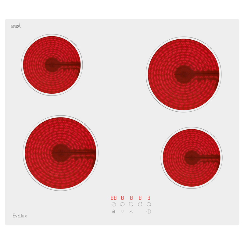 Зоны нагрева Evelux оборудованы современными нагревательными элементами Hi-light. Конфорка достигает установленной рабочей температуры буквально за считанные секунды, позволяет плавно регулировать мощность.