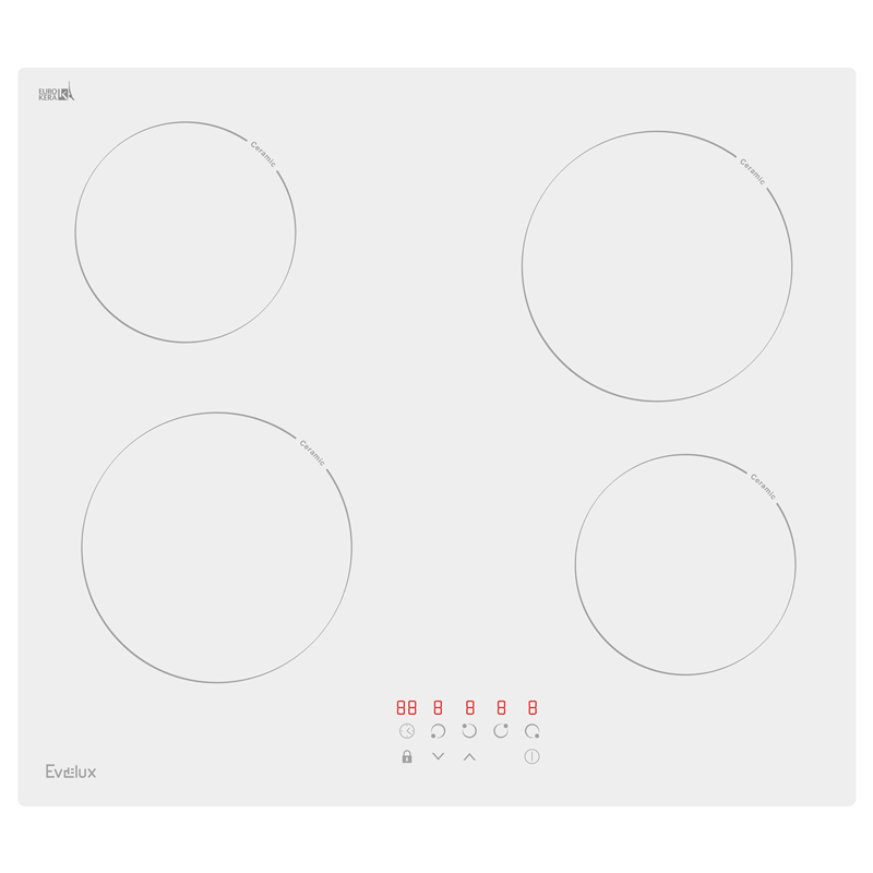 Зоны нагрева Evelux оборудованы современными нагревательными элементами Hi-light. Конфорка достигает установленной рабочей температуры буквально за считанные секунды, позволяет плавно регулировать мощность.