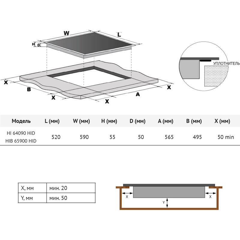 Поверхность изготовлена из прочной стеклокерамики черного цвета, устойчивой к механическим повреждениям и высоким температурам. Стандартные габариты 590 х 520 х 60 мм и вес 7,84 кг позволяют легко встроить панель в кухонную столешницу, для чего требуется ниша размерами 565 x 495 мм.