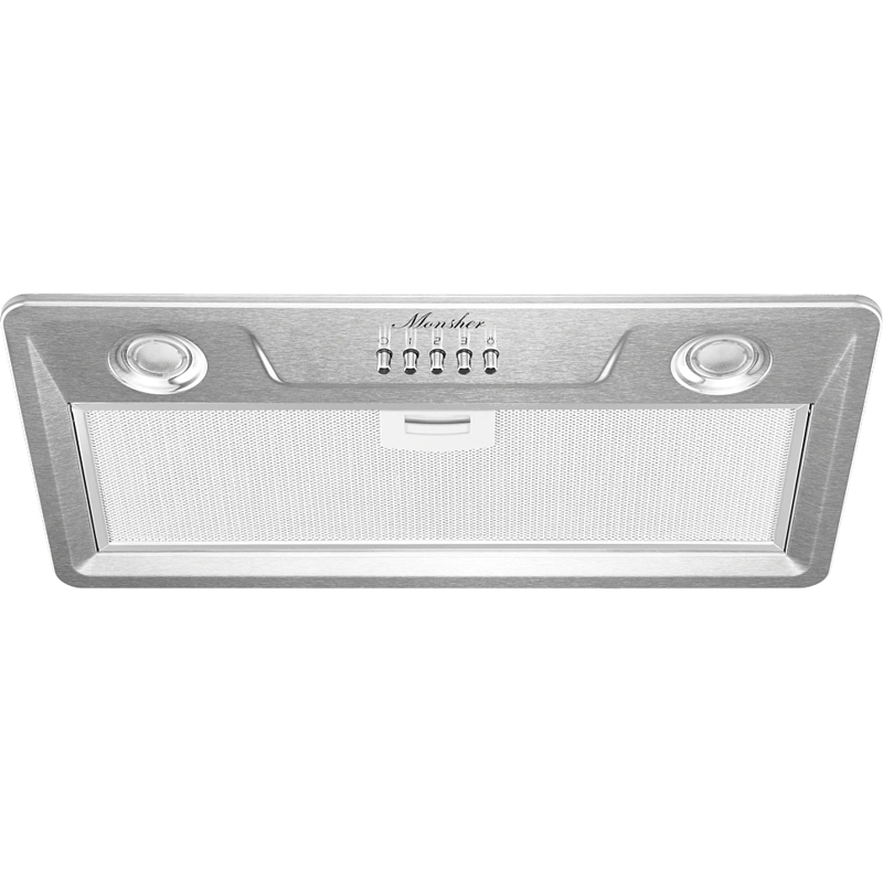 Встраиваемая вытяжка Monsher Inhit 60 Acier монтируется в шкаф, снаружи остается только лаконичная панель с элементами управления, что позволяет вписать эту модель в интерьер практически в любом стиле. Ширина устройства составляет 52,5 см, высота — 20,3 см, а глубина — 27,5 см.