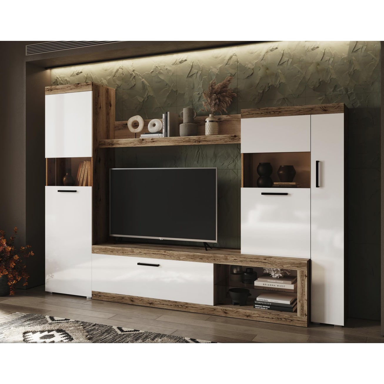 Гостиная "Бастон" понравится современным жителям большого города. Здесь отлично смотрится большой телевизор, а фанаты литературы смогут разместить любимые книги на полках.