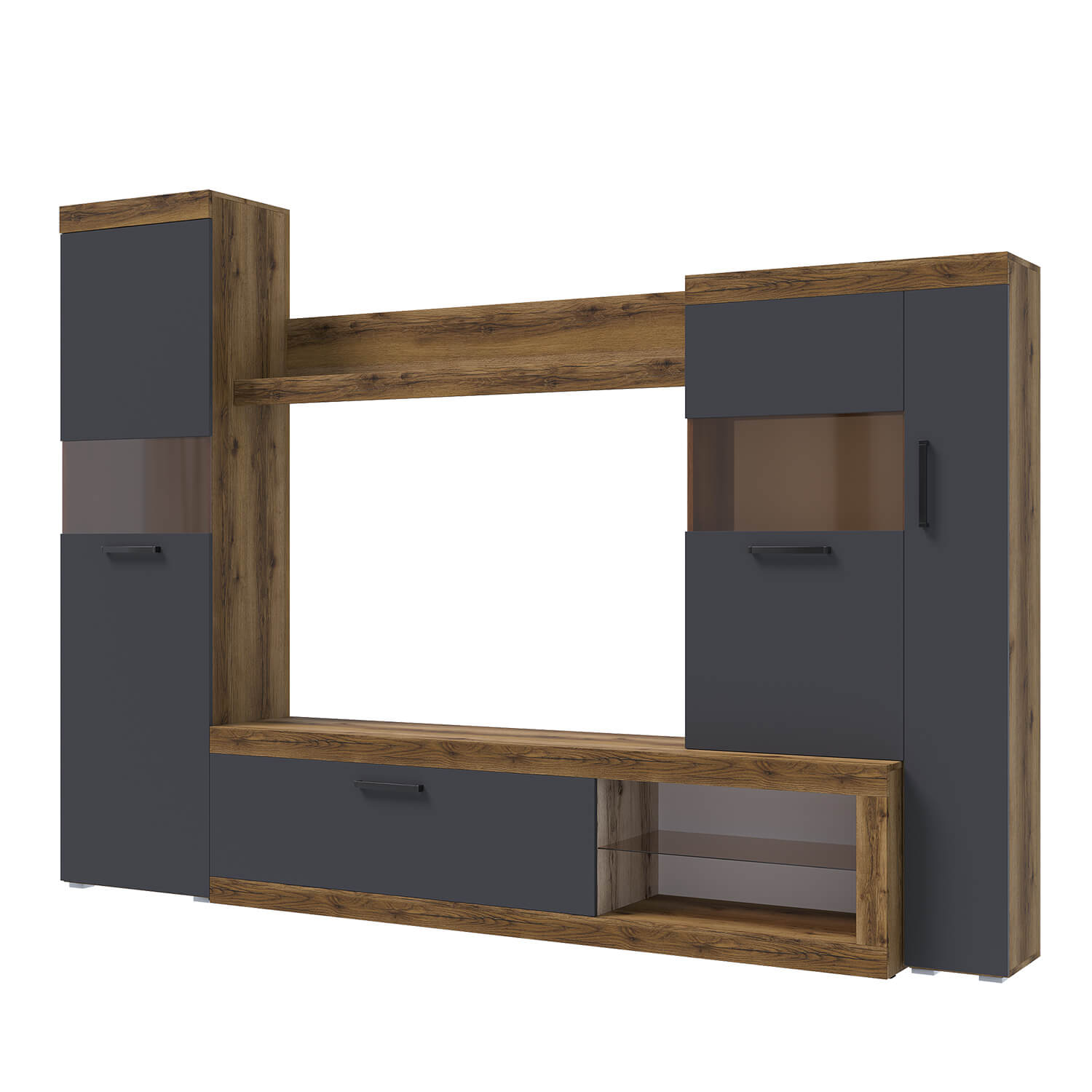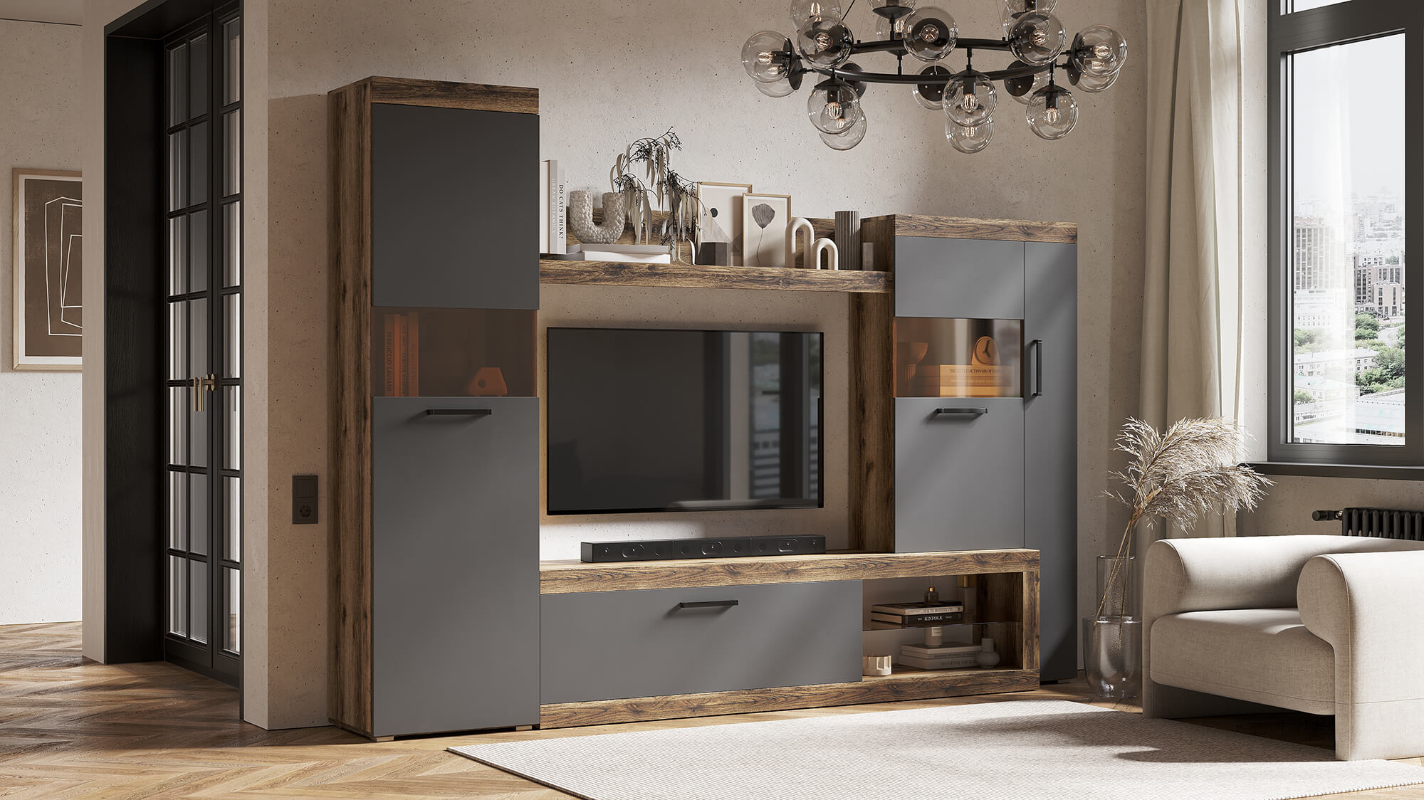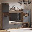 Гостиная "Бастон" понравится современным жителям большого города. Здесь отлично смотрится большой телевизор, а фанаты литературы смогут разместить любимые книги на полках.