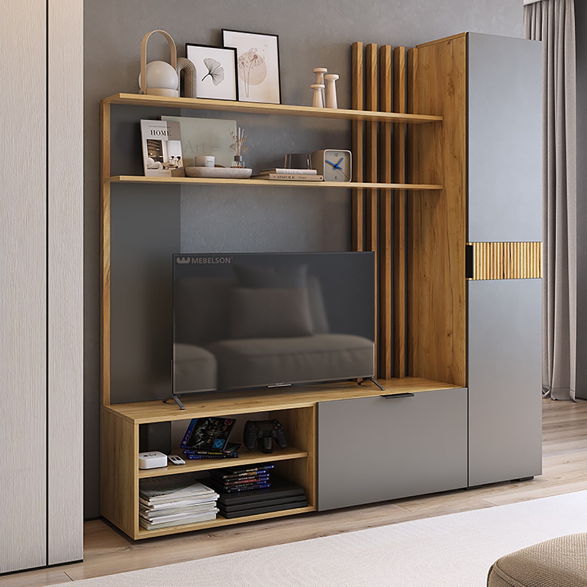 Гостиная "Бери"- это закрытые и открытые секции, место для ТВ с диагональю до 55 дюймов и декоративными полками для ценных и важных мелочей.