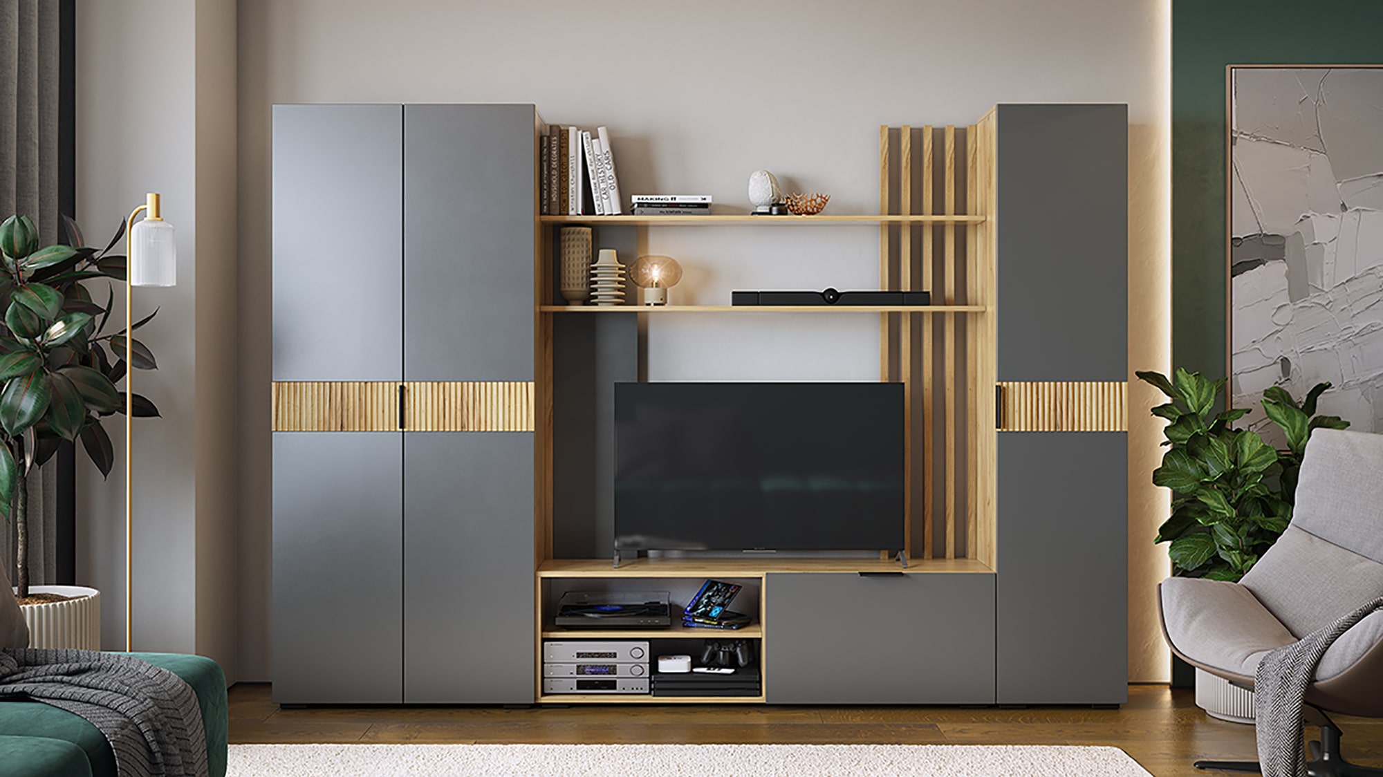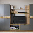 Гостиная "Бери"- это закрытые и открытые секции, место для ТВ с диагональю до 55 дюймов и декоративными полками для ценных и важных мелочей.