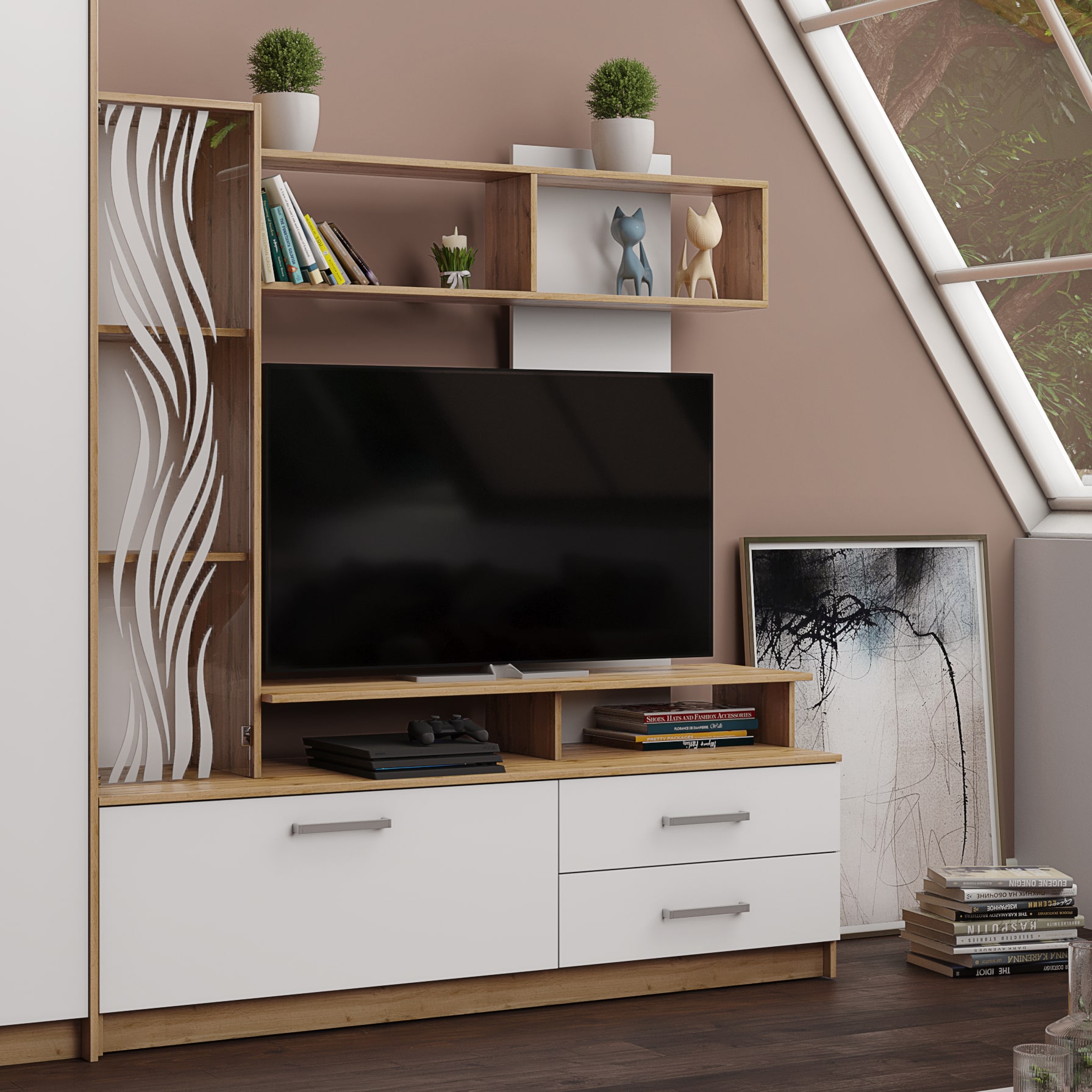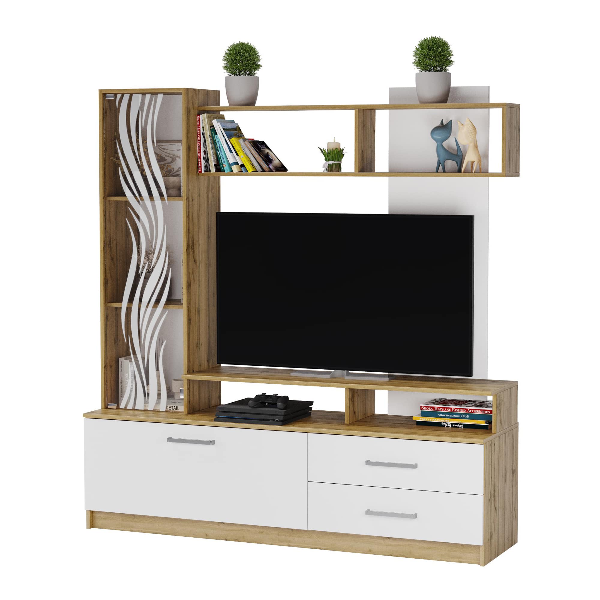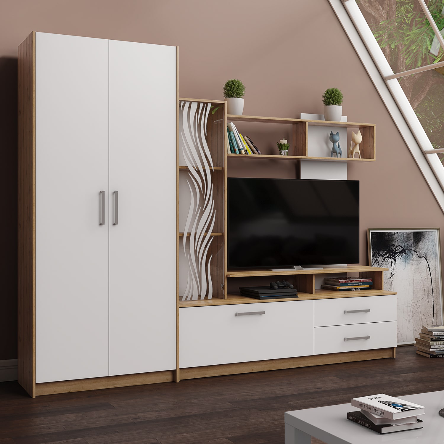 Гостиная Дарья – это компактная стенка, которая ничем не уступает по вместительности большим гарнитурам. На стеклянном фасаде стеллажа нанесен интересный волнообразный орнамент.