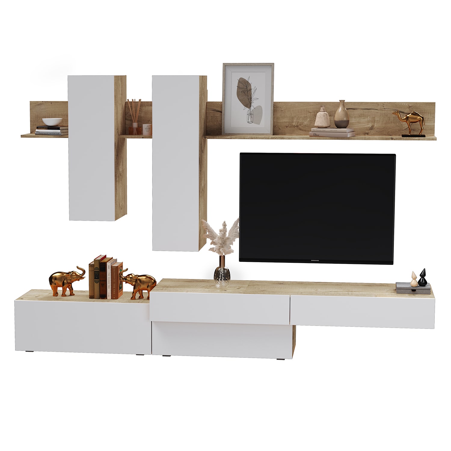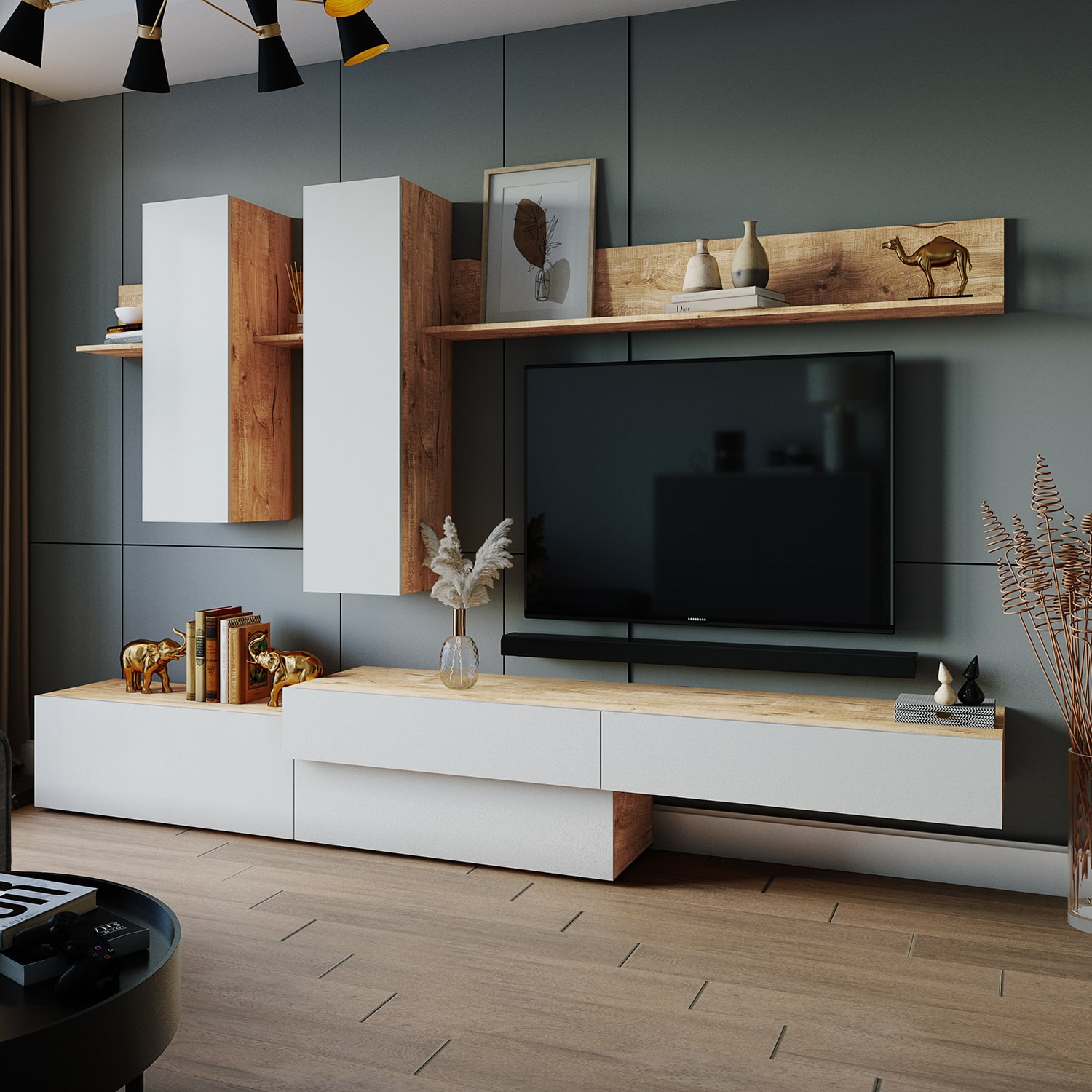 В состав комплекта входят полки навесные, шкаф подвесной и тумба под ТВ. Это позволяет максимально эффективно использовать пространство и хранить все необходимые вещи.