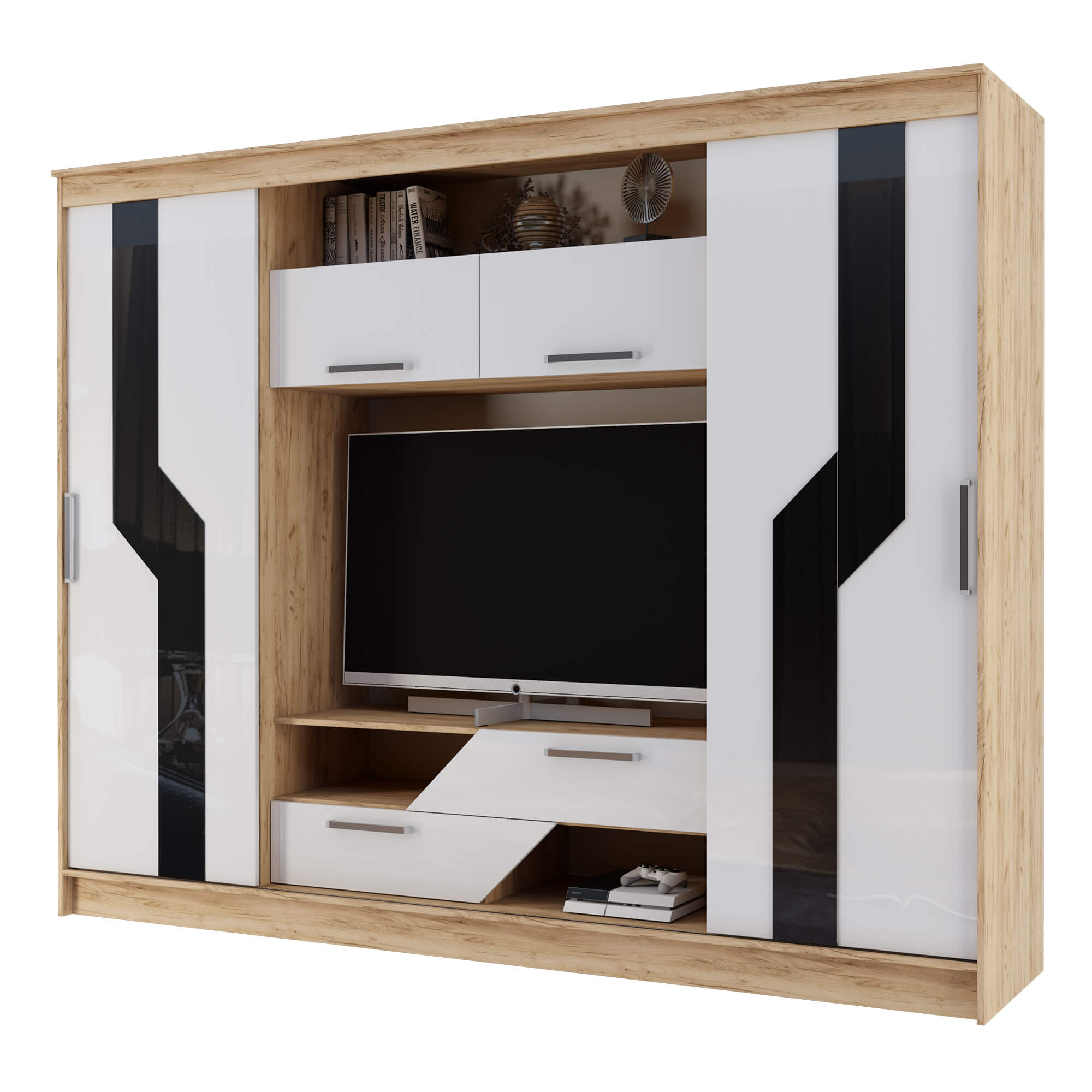 Гостиная оснащена раздвижными и откидными дверями, что обеспечивает удобный доступ к содержимому шкафа. Полки позволяют разместить большое количество вещей.