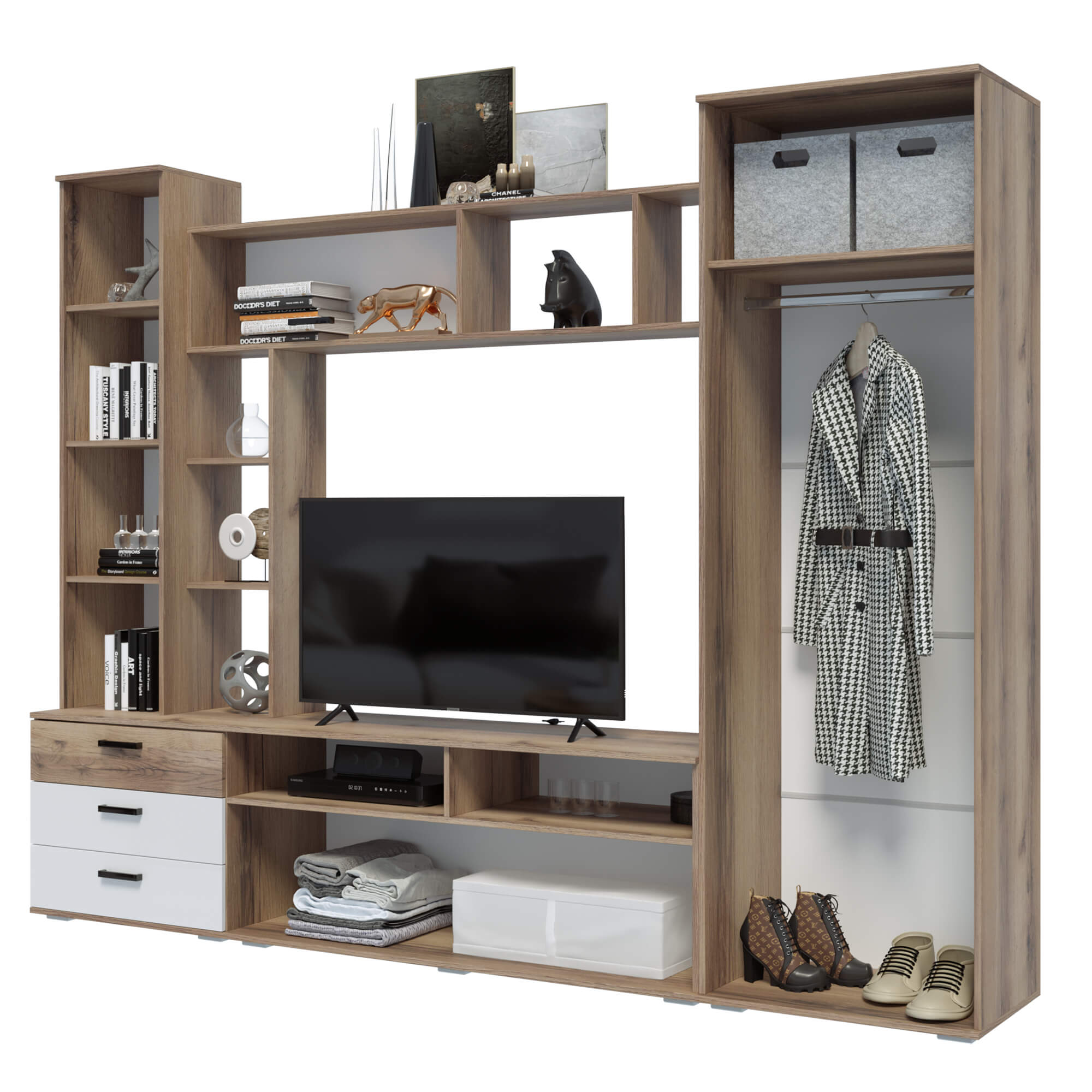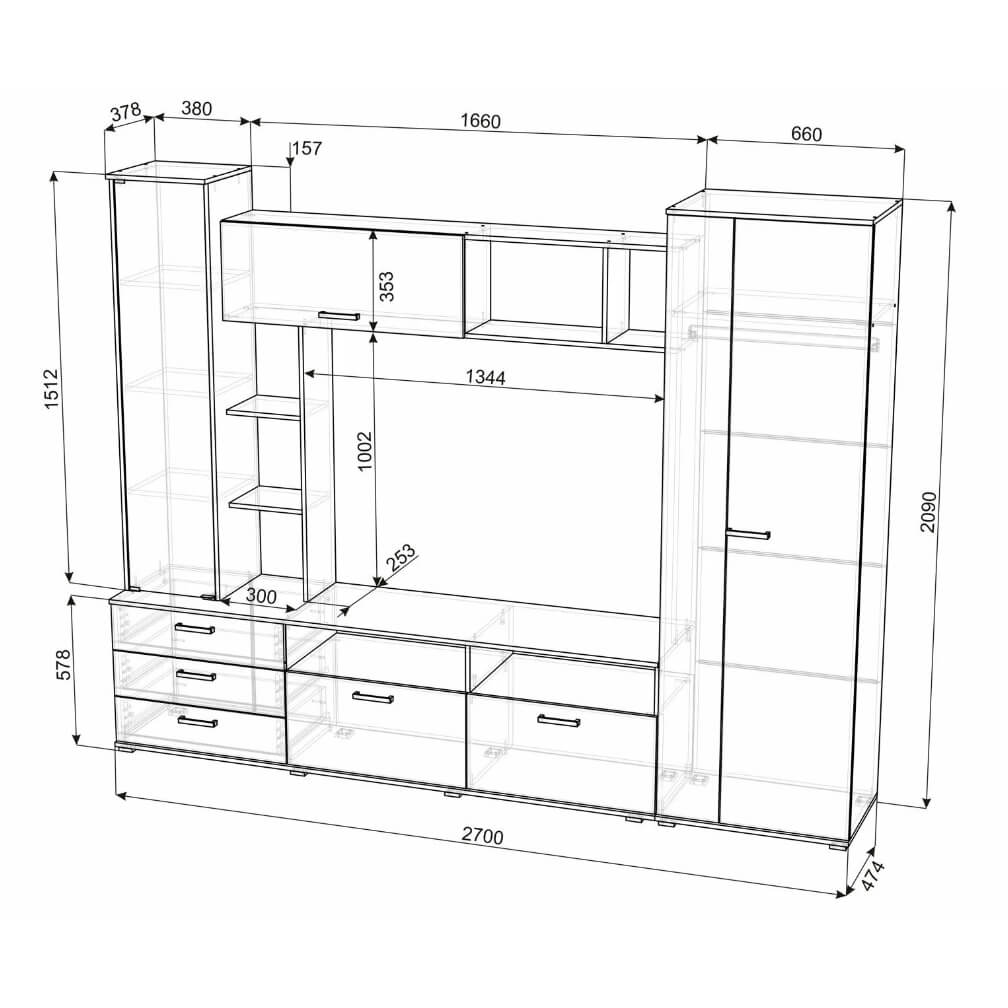Стенка Крокус не только стильная и современная, но и функциональная гостиная. Здесь отлично смотрится большой телевизор, имеются отделения для хранения аппаратуры, дисков, журналов, в стеллаже прекрасно разместятся любимые книги, а на полках есть место декоративным мелочам и фотографиям. Кроме этого, достоинством модели является вместительный шкаф со штангой и полкой для одежды.