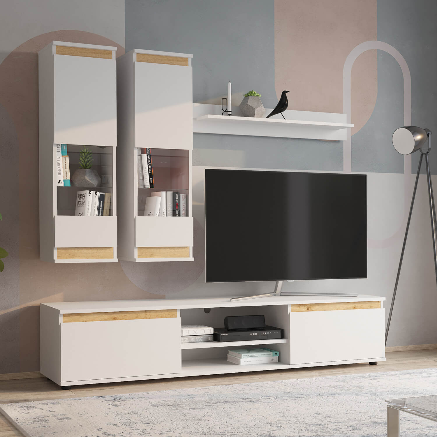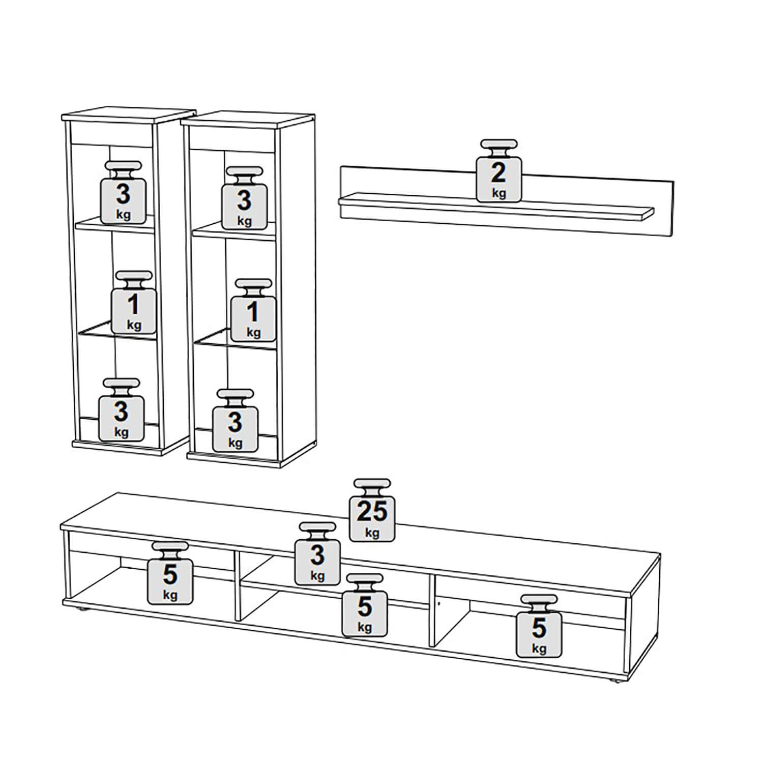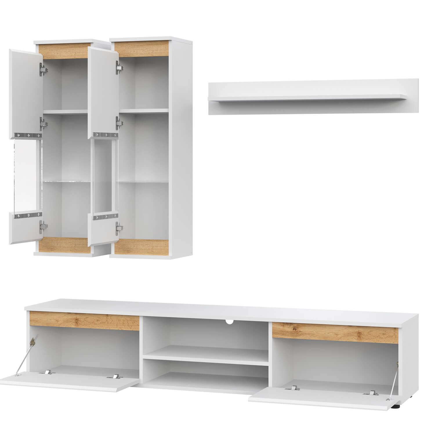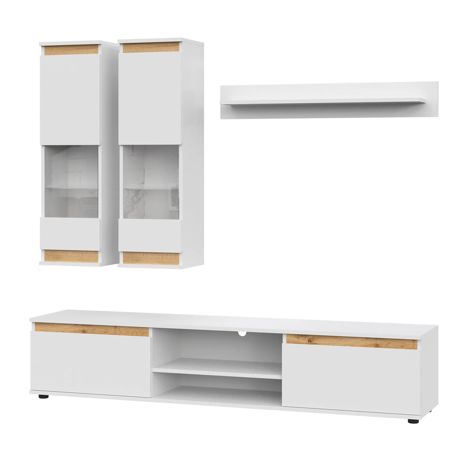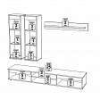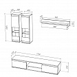 В комплект входит: полка навесная, шкаф витрина навесной (2 шт), тумба под ТВ.