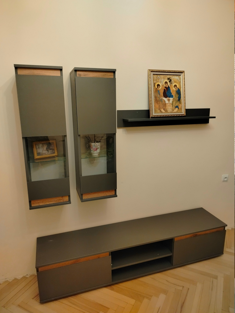 В комплект входит: полка навесная, шкаф витрина навесной (2 шт), тумба под ТВ.
