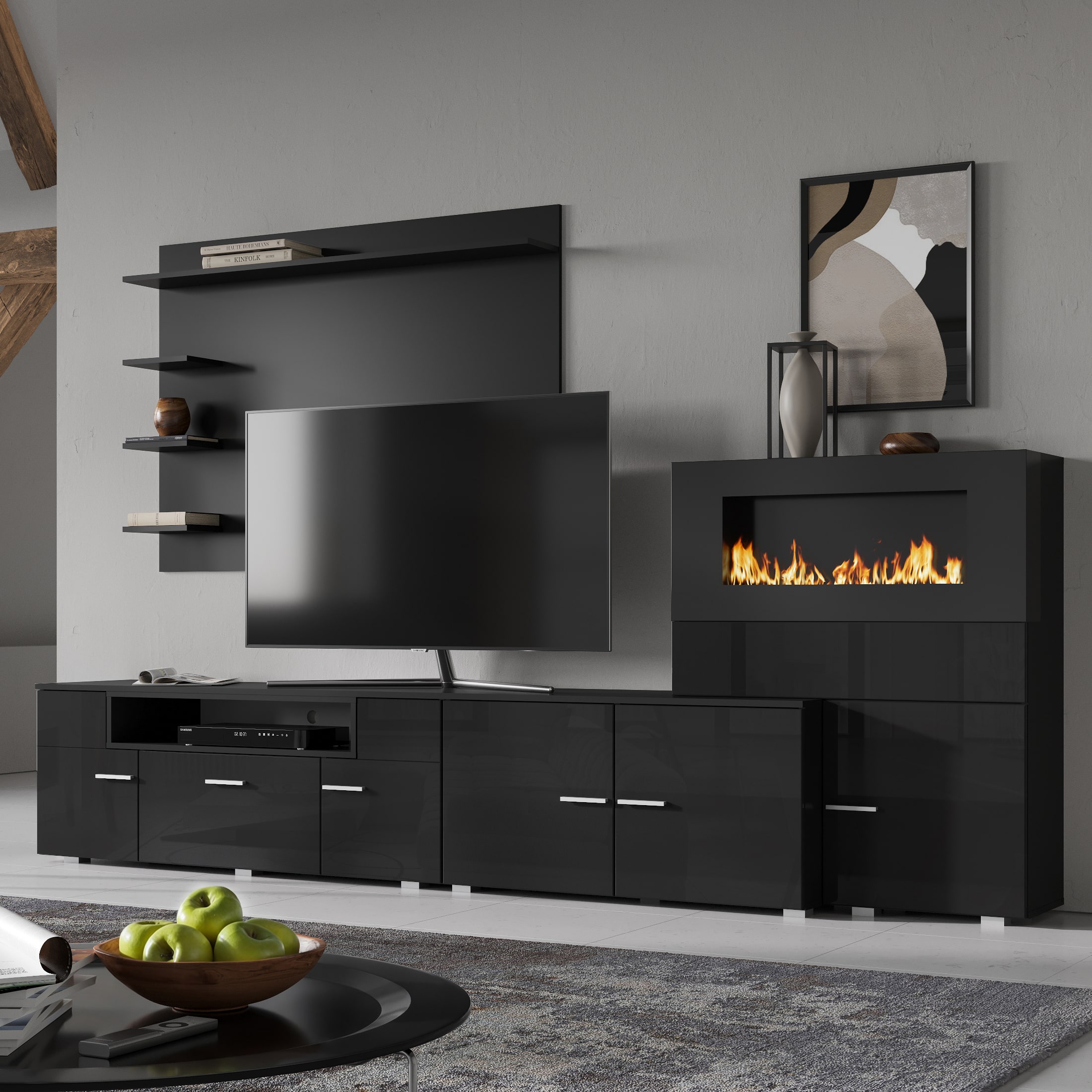 Гостиная НК RALF Черный/Черный глянец с биокамином