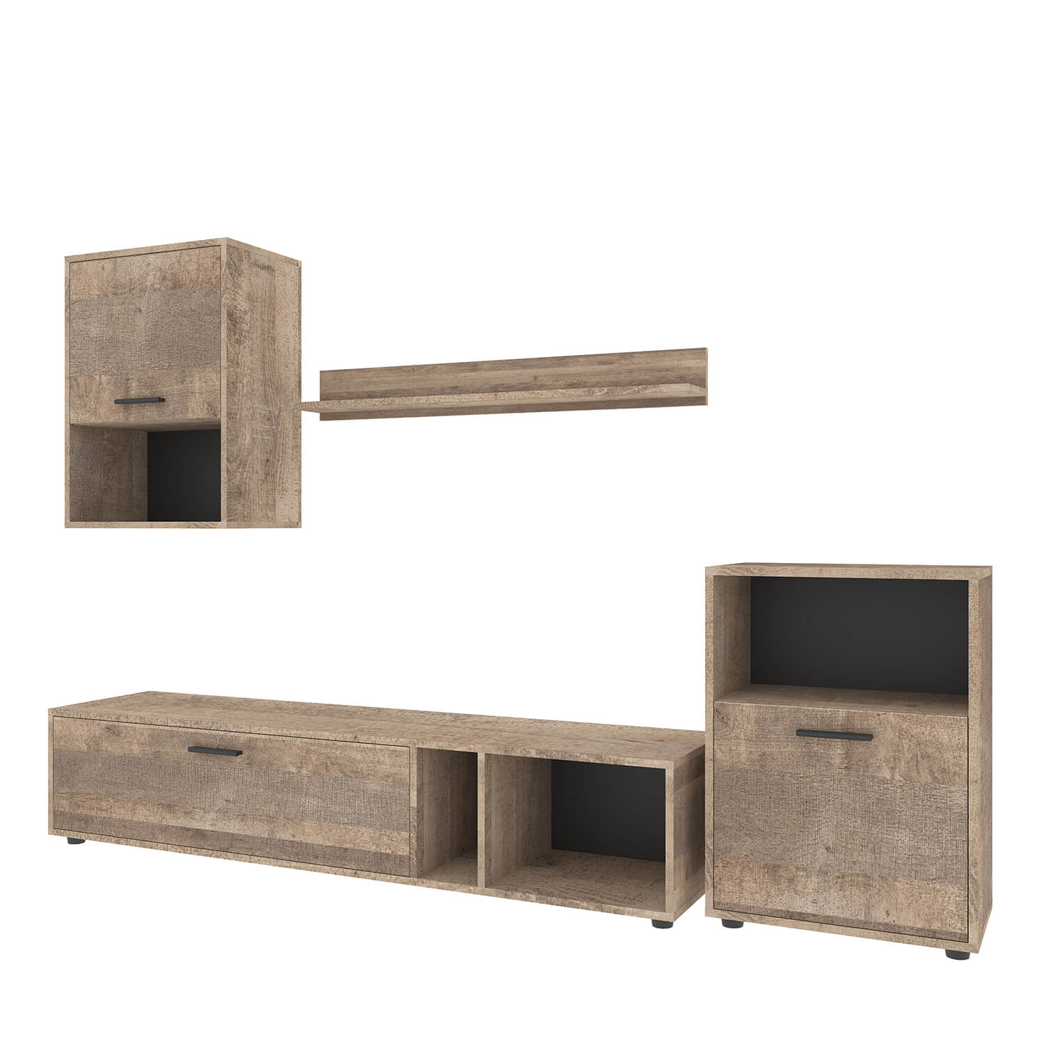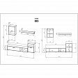 В комплект входят четыре предмета мебели: подвесной и стоячий шкафы, а также тумба под ТВ и полка. Размеры каждого предмета варьируются от 160 см в ширину до 36 см в глубину.