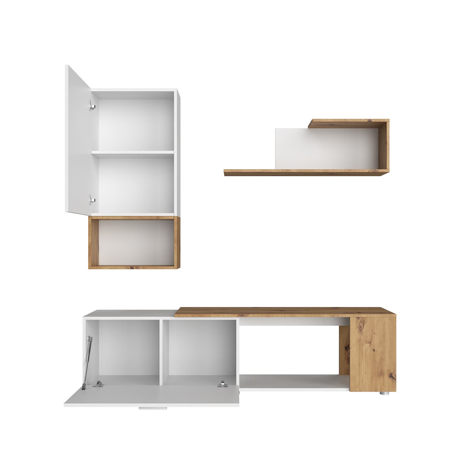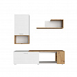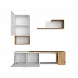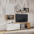 В комплект гостиной входят навесная полка, шкаф с полкой и тумба под ТВ, что позволяет максимально эффективно использовать пространство и организовать хранение различных предметов.