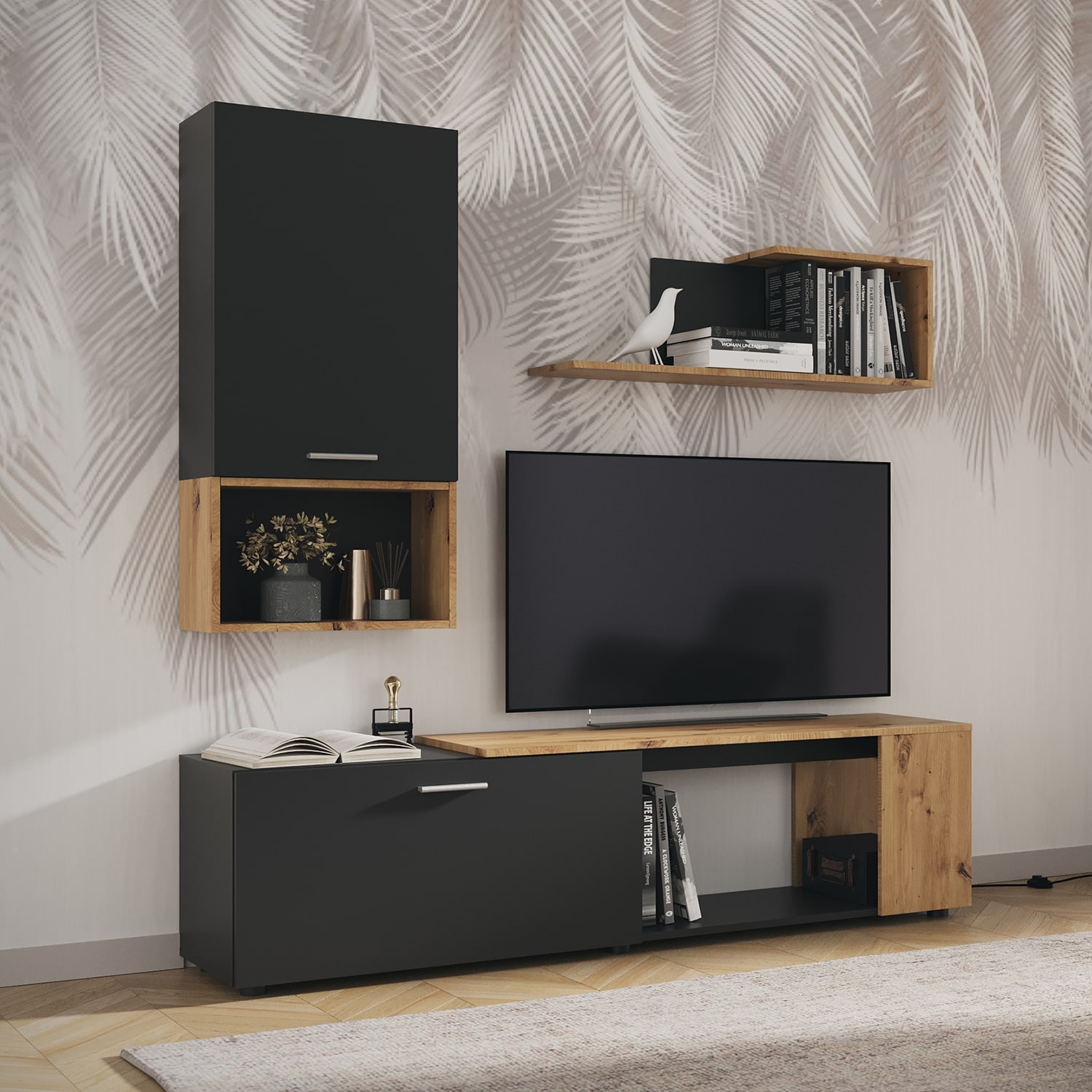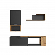 Черный цвет гостиной сочетается с оттенками дуб артизан, создавая уютную и теплую атмосферу в помещении.