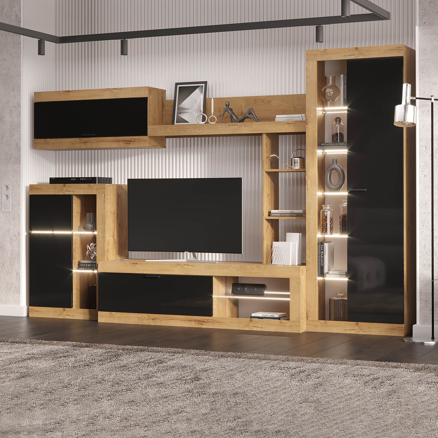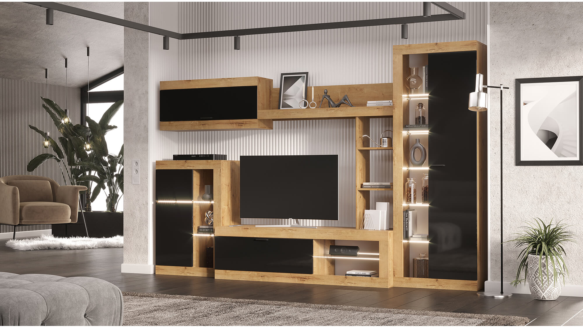 Создать комфортную и красивую гостиную — это искусство, которое требует внимания к каждой детали. Сочетание Дуба Вотан с чёрным глянцем делает мебель одновременно строгой и лаконичной, при этом стильной и уютной, а что самое важное – черный цвет универсальный и классический. Он подходит к любому стилю и сочетается со всей цветовой палитрой.