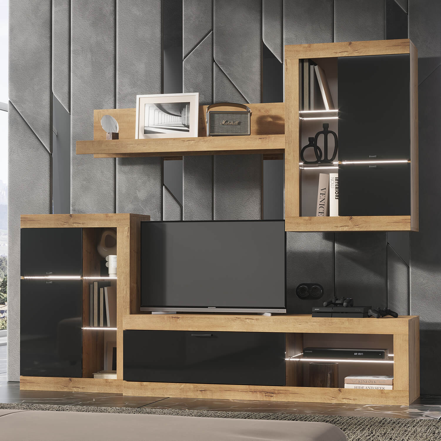Создать комфортную и красивую гостиную — это искусство, которое требует внимания к каждой детали. Сочетание Дуба Вотан с чёрным глянцем делает мебель одновременно строгой и лаконичной, при этом стильной и уютной, а что самое важное – черный цвет универсальный и классический. Он подходит к любому стилю и сочетается со всей цветовой палитрой.