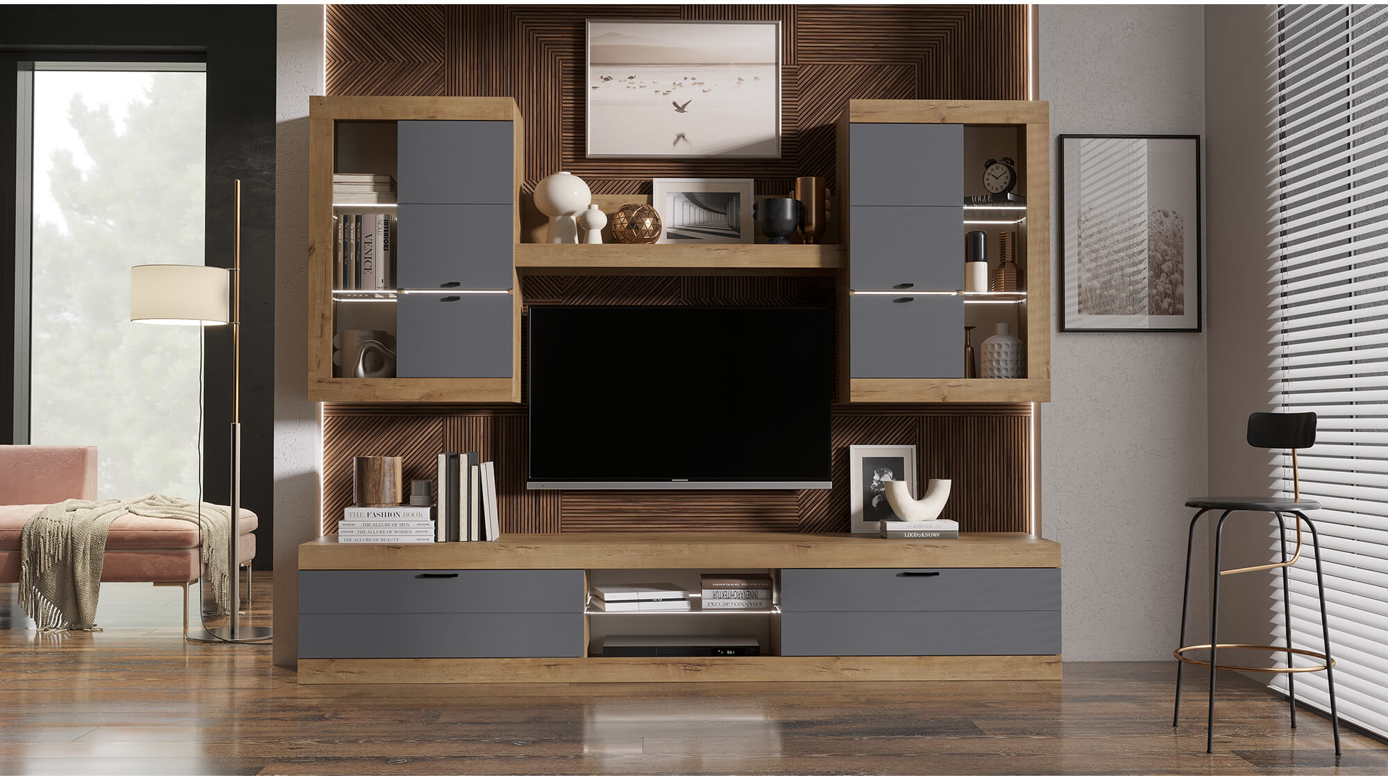 Погрузитесь в современный дизайн с нашей новой гостиной Прага. Теплый оттенок Дуба Вотан прекрасно сочетается с фасадами цвета графит, создавая элегантный контраст. Гостиная Прага гармонично впишется в любой интерьер, а возможность подсветки создаст атмосферу комфорта.