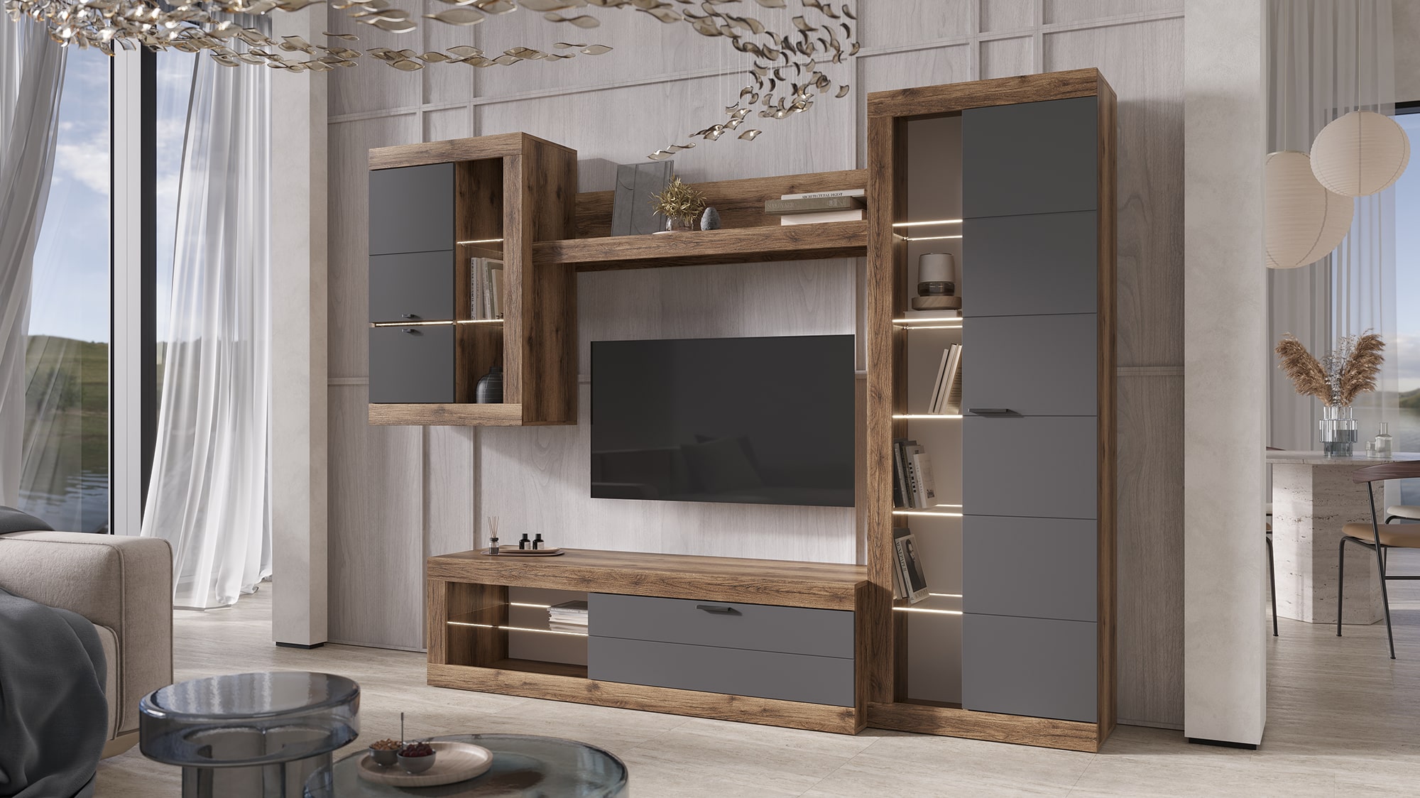 Создать комфортную и красивую гостиную — это искусство, которое требует внимания к каждой детали. Сочетание Дуба Делано с серым делает мебель одновременно строгой и лаконичной, при этом стильной и уютной, а что самое важное – серый цвет универсальный и классический. Он подходит к любому стилю и сочетается со всей цветовой палитрой.