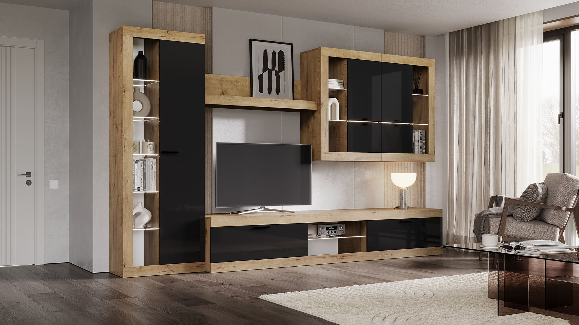 Создать комфортную и красивую гостиную — это искусство, которое требует внимания к каждой детали. Сочетание Дуба Вотан с чёрным глянцем делает мебель одновременно строгой и лаконичной, при этом стильной и уютной, а что самое важное – черный цвет универсальный и классический. Он подходит к любому стилю и сочетается со всей цветовой палитрой.