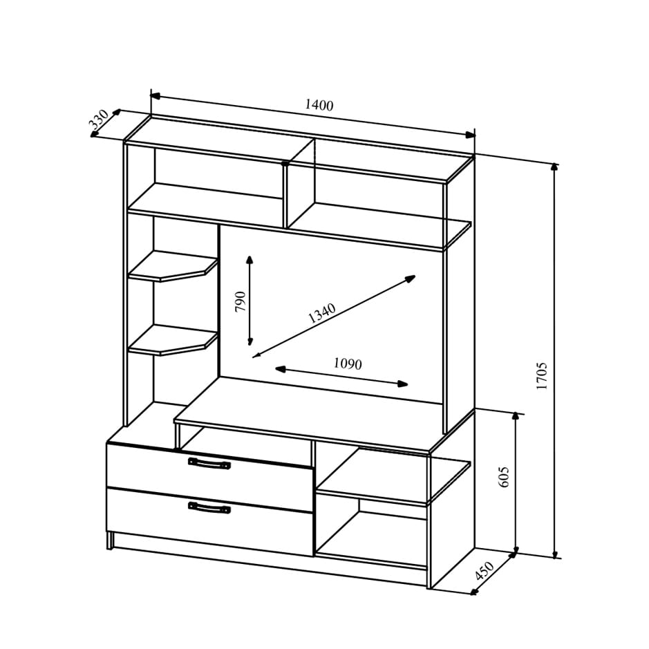 Габариты стенки составляют 140 x 45 x 170,5 см, что позволяет разместить ее даже в небольших помещениях.