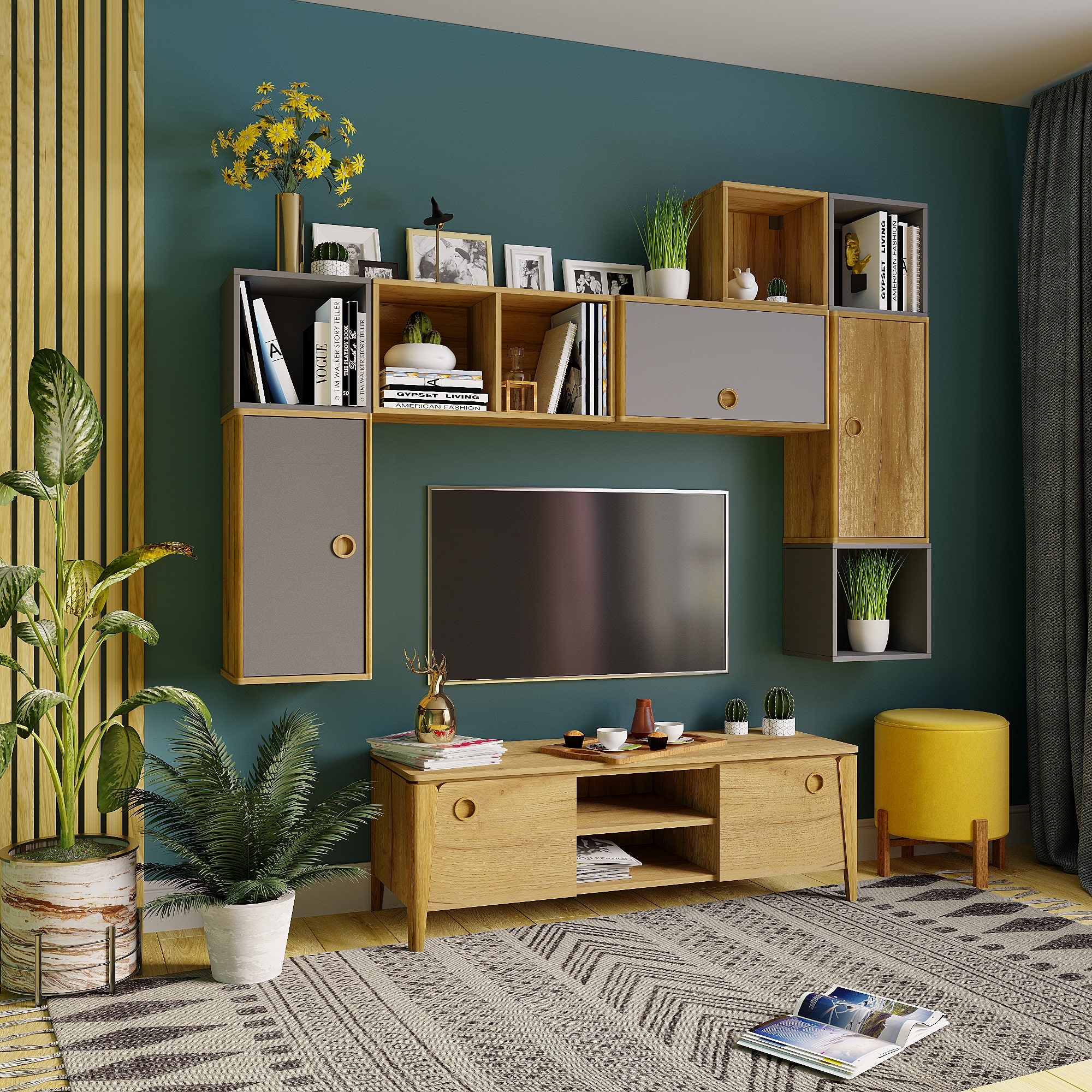 Тумба под ТВ богатой фактурой золотистого дуба. Стильные врезные ручки и декоративные закругленные накладки из натурального дуба. Петли с доводчиками обеспечат тишину и плавность закрывания.